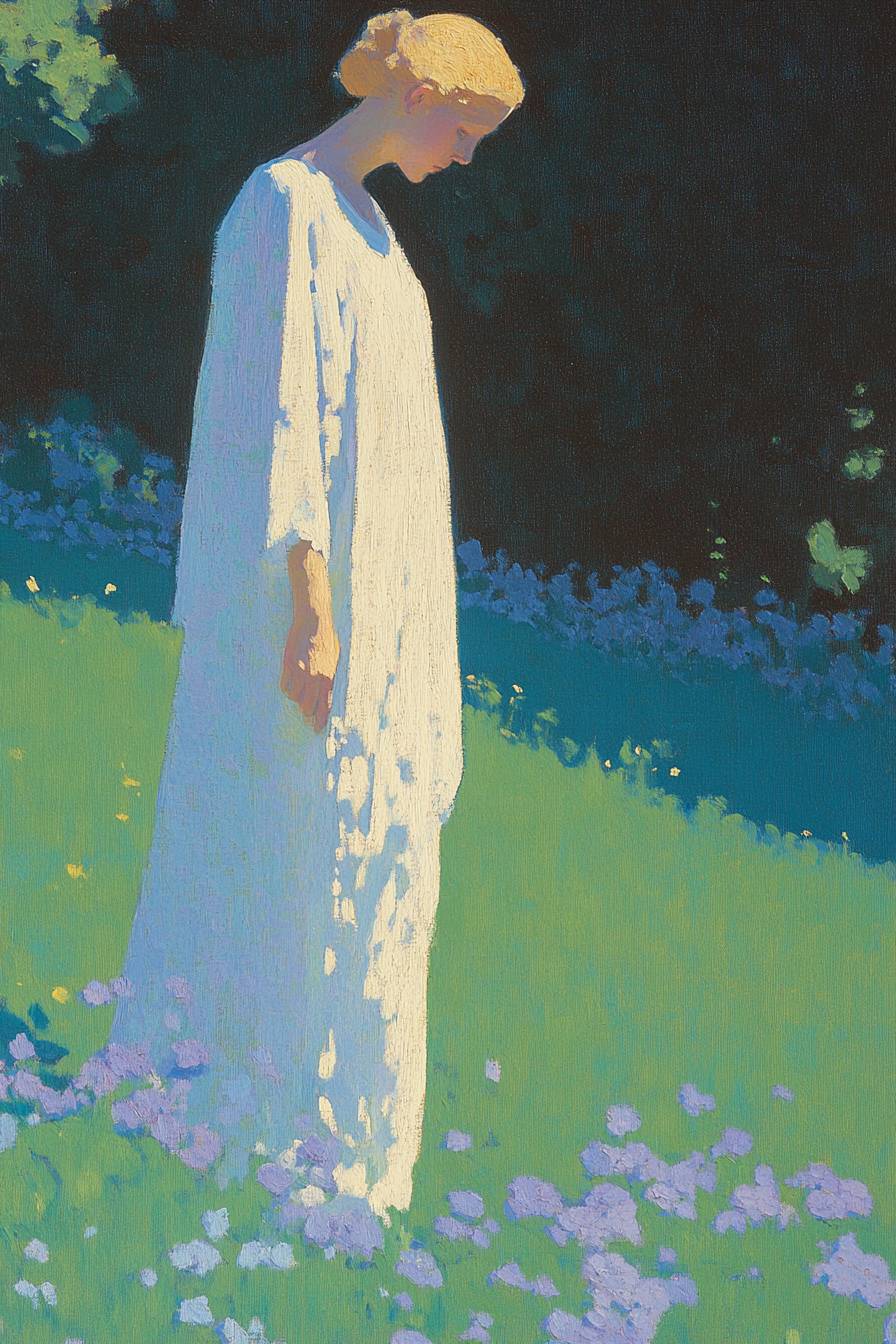 A painting of the garden, in light green and purple tones, with an abstract expressionist style that includes large areas of white space. The figure is depicted as being illuminated by sunlight . It features a central composition and rich details, rendered using the oil on canvas technique. --ar 2:3 --personalize 369x7uv --stylize 1000 --v 6.1