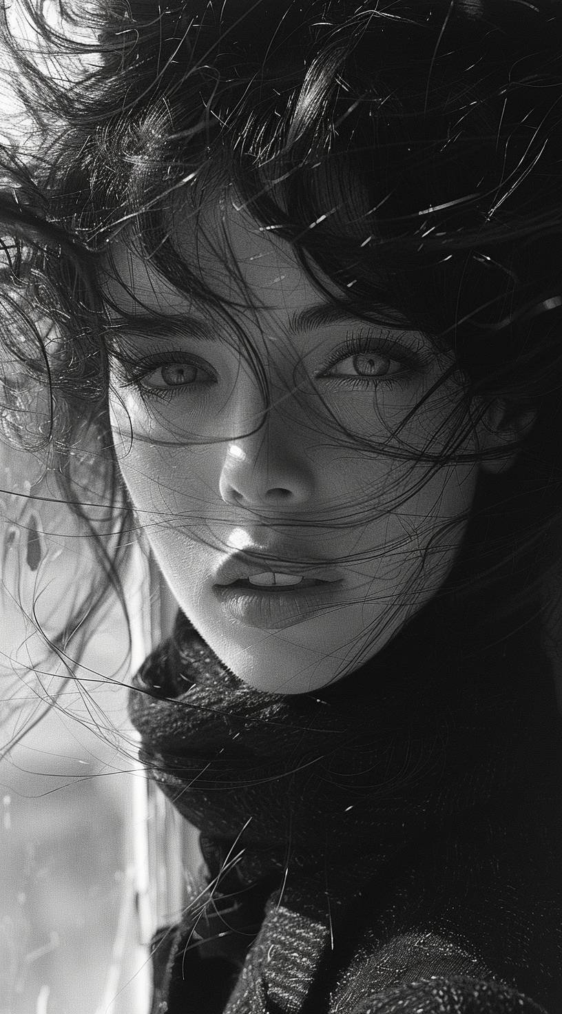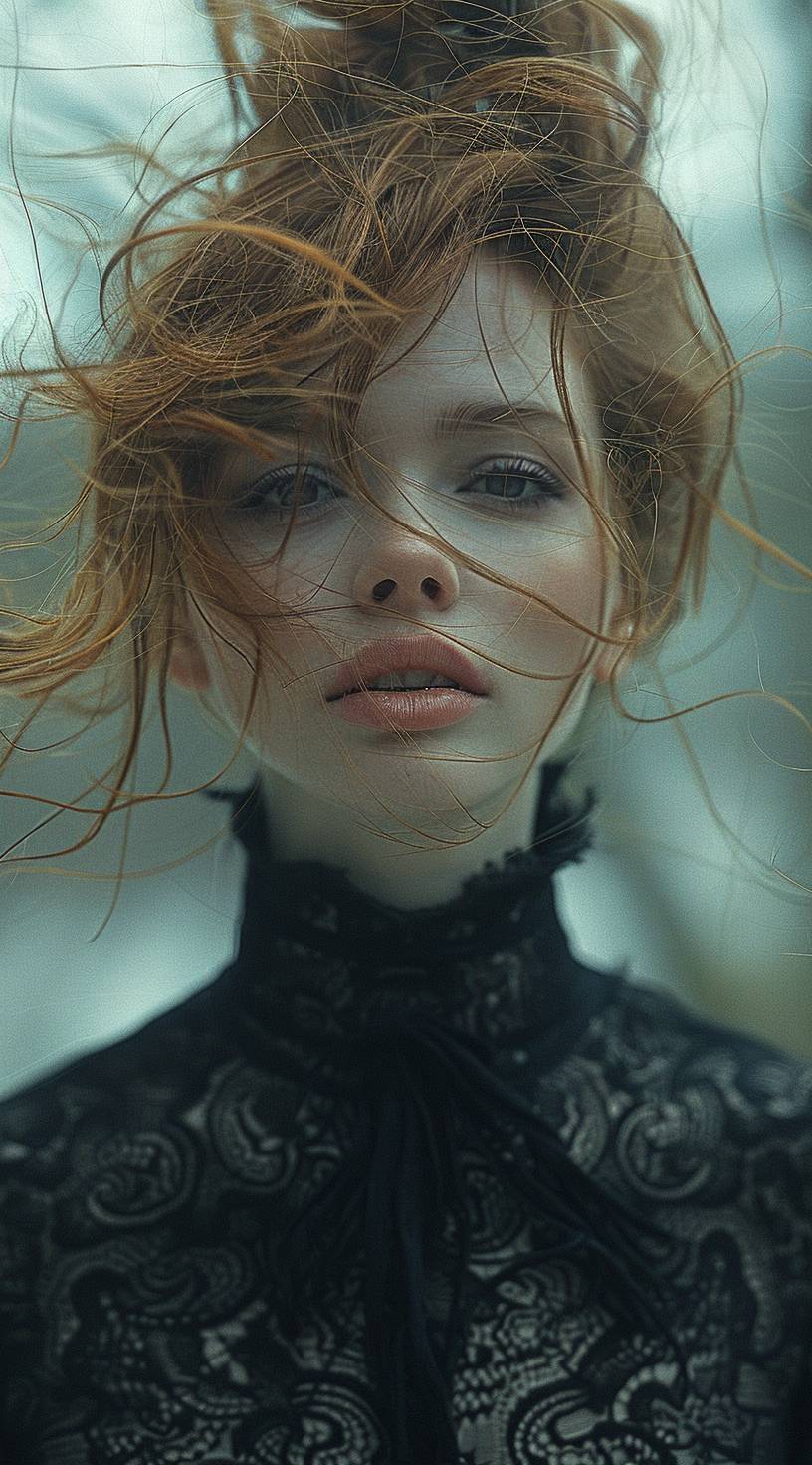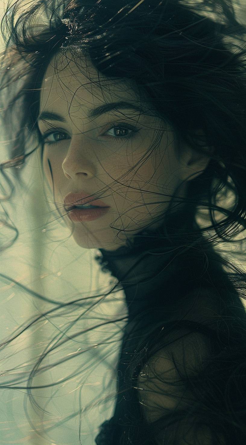a woman with long wild hair on a windy day, in the style of toy camera effects, haunting elegance, frozen movement, captivating gaze, voigtlander bessa r2m, black paintings, new york school --ar 71:128 --stylize 750 --v 6.0