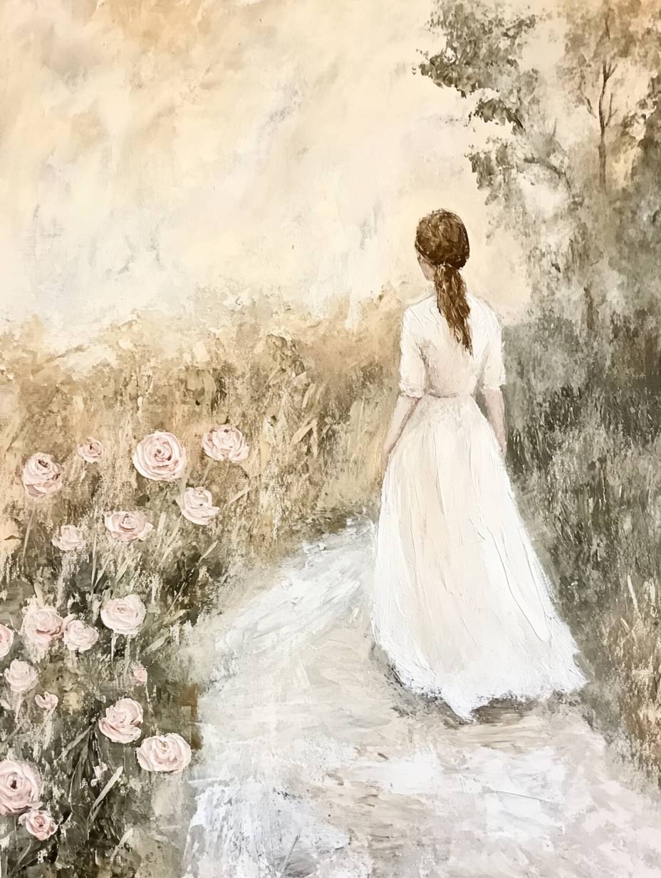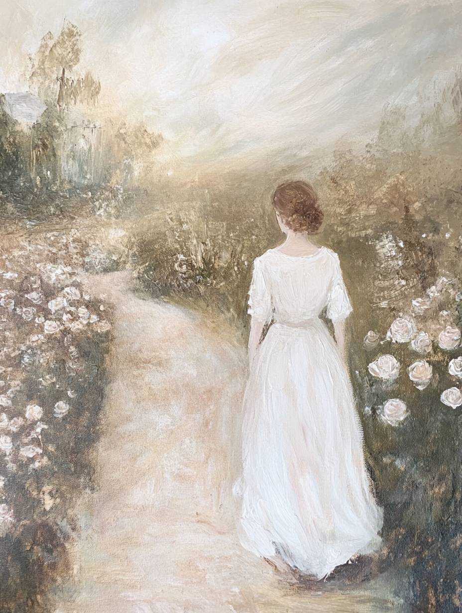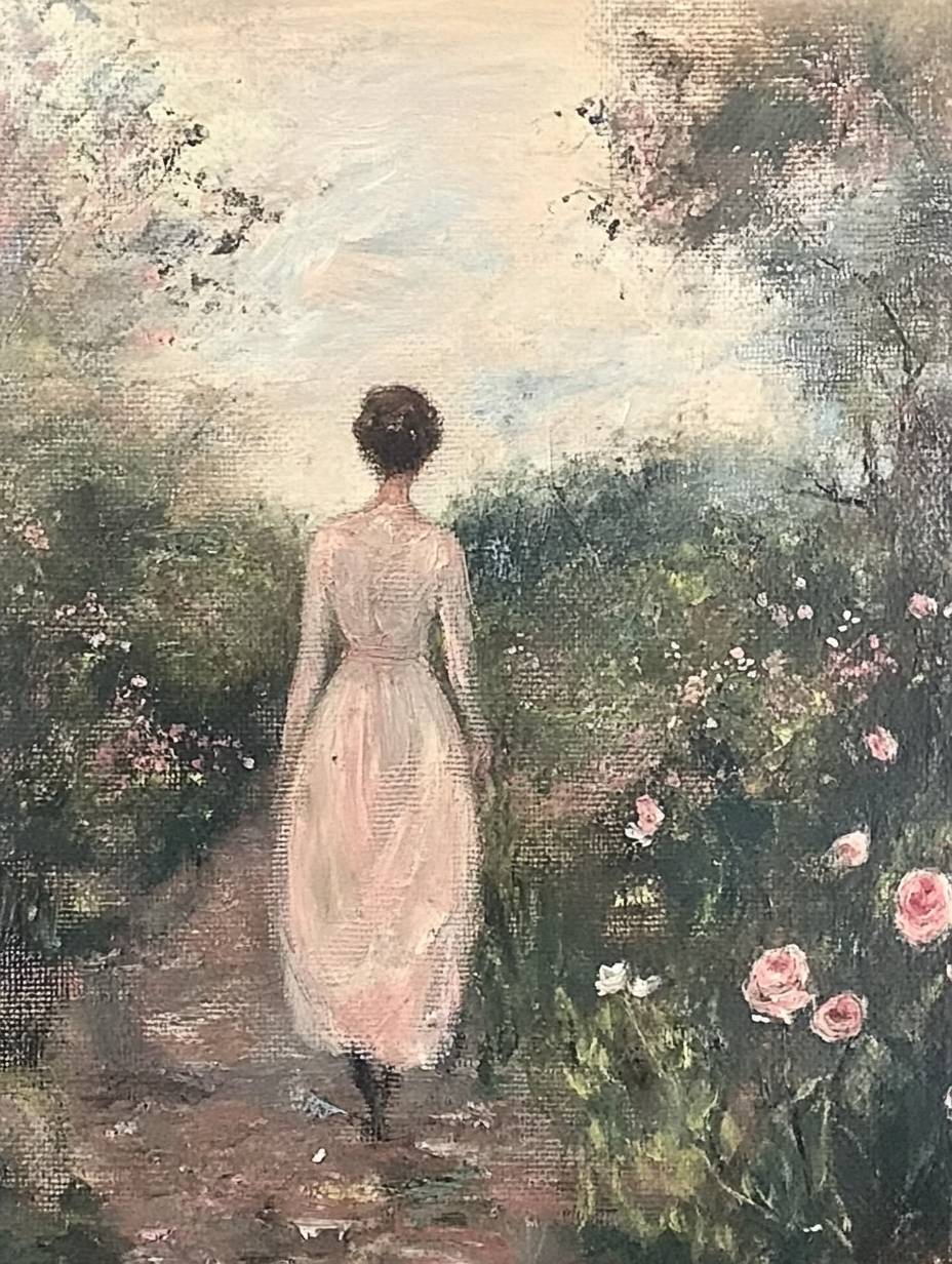 伊麗莎白·班納特在《傲慢與偏見》中走向彭伯利。柔和的暗淡色調。玫瑰花園。夢幻般的感覺。油畫,帶有一些劃痕和塗料痕跡,風格類似於海倫·艾靈漢。