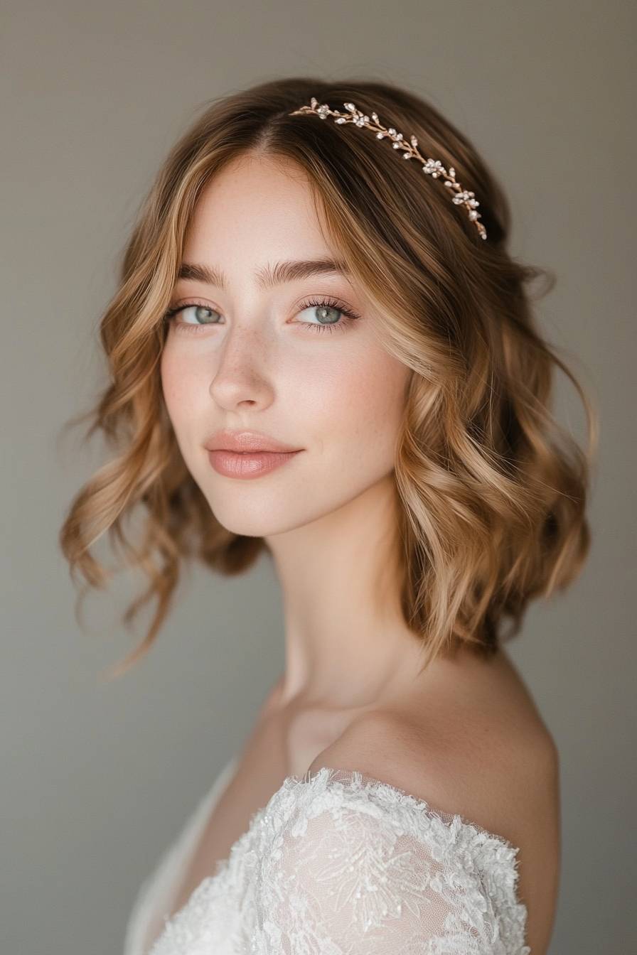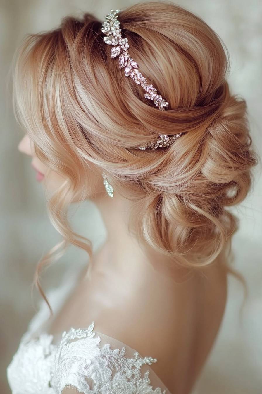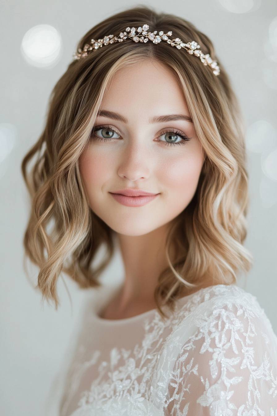 Jeweled headband, soft pink blush and beige hair colors, romantic wedding updo with loose waves, half-up hairstyle for the bride, vintage style, elegant white dress, close-up photo of a woman in her thirties with medium-length wavy blonde-to-brown ombre hair, side parting, soft glam makeup, studio lighting, bokeh background, highly detailed, sharp focus. --ar 2:3 --v 6.1