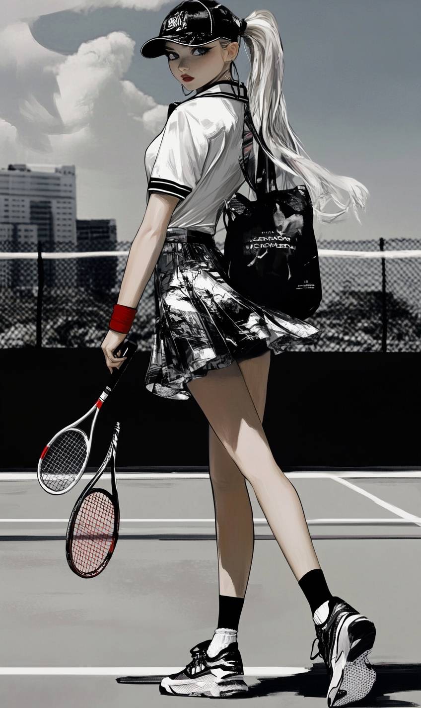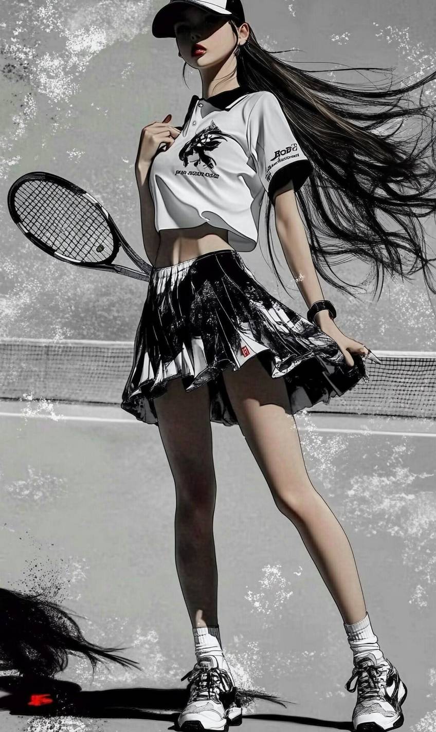 動漫女孩,運動時尚,網球裙,馬球恤,遮陽帽,網球鞋,戶外球場。