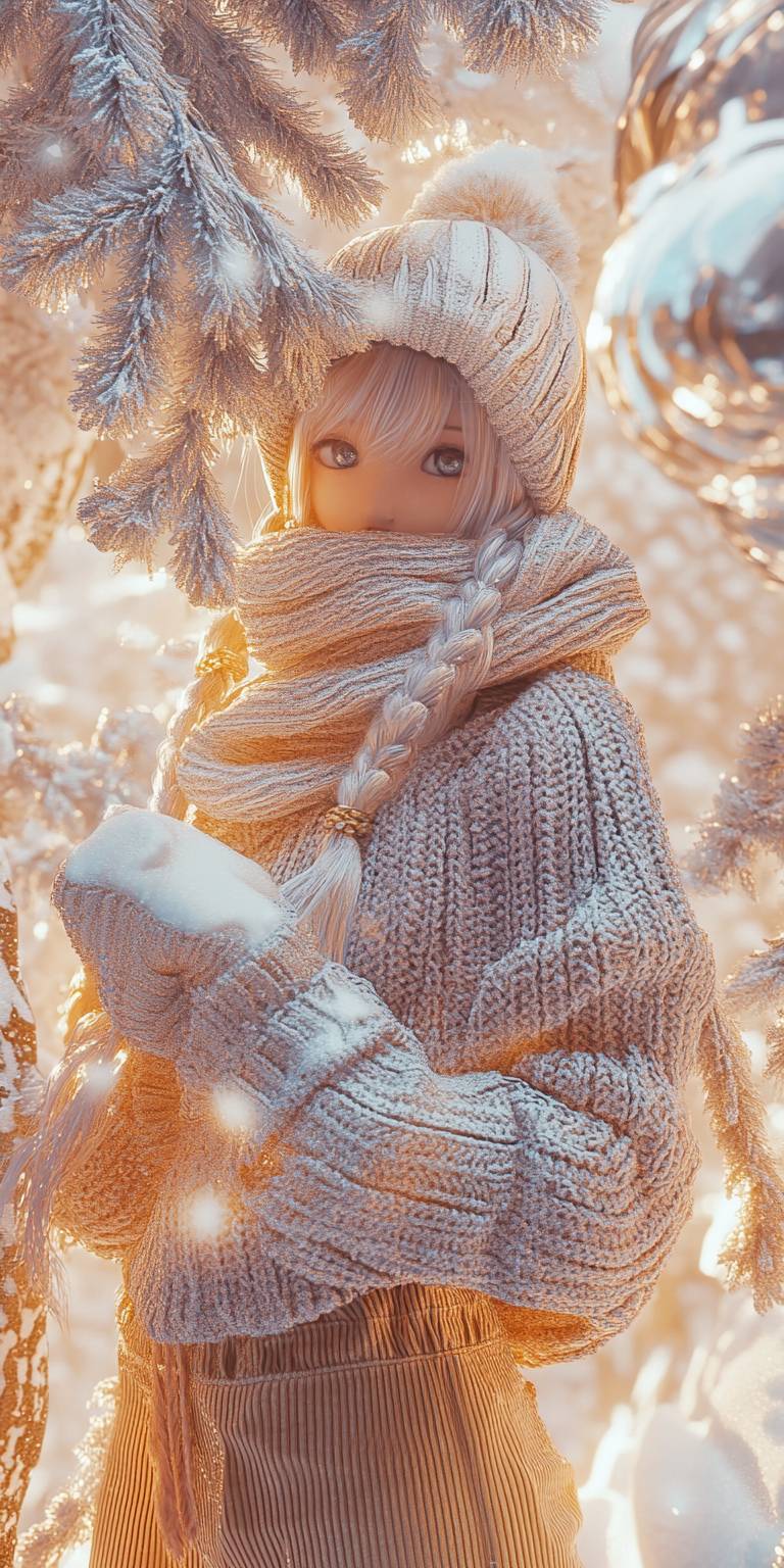 Anime female character, cozy sweater, corduroy pants, scarf, winter gloves, snow-covered park. --sref 121044268 --ar 1:2