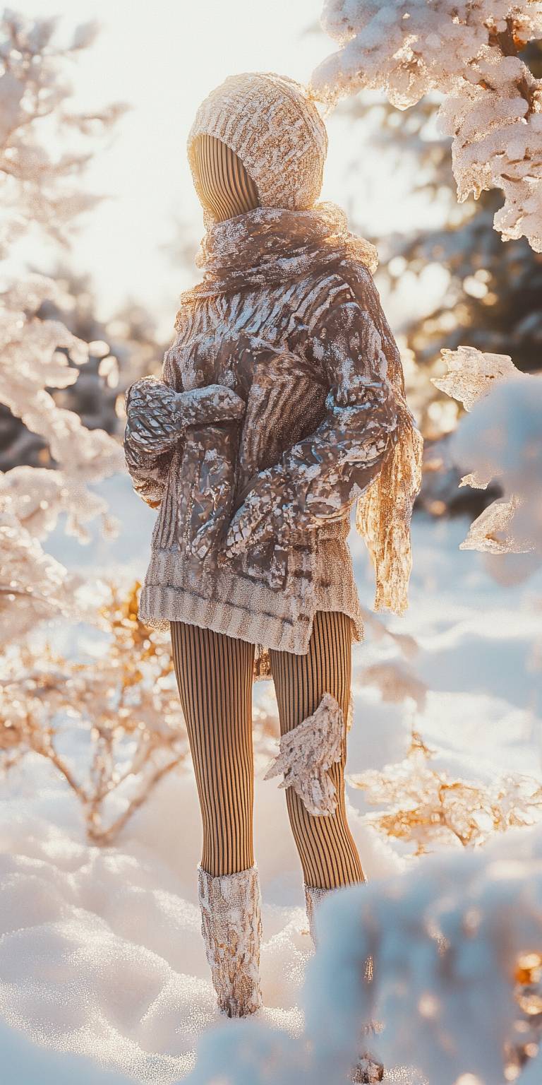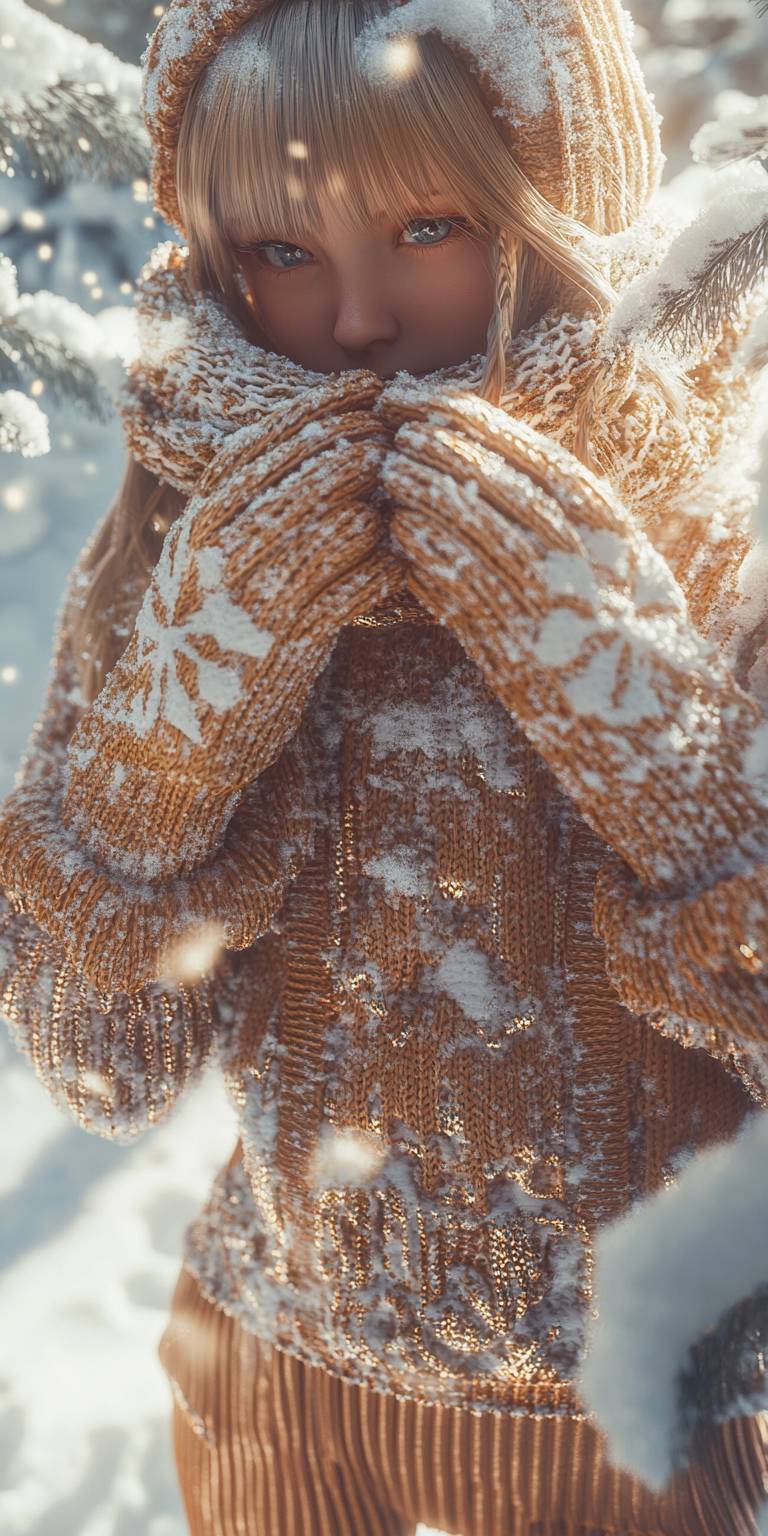 動漫中的女性角色,穿著舒適的毛衣、燈芯絨褲子,圍著圍巾,戴著冬季手套,在被雪覆蓋的公園中。