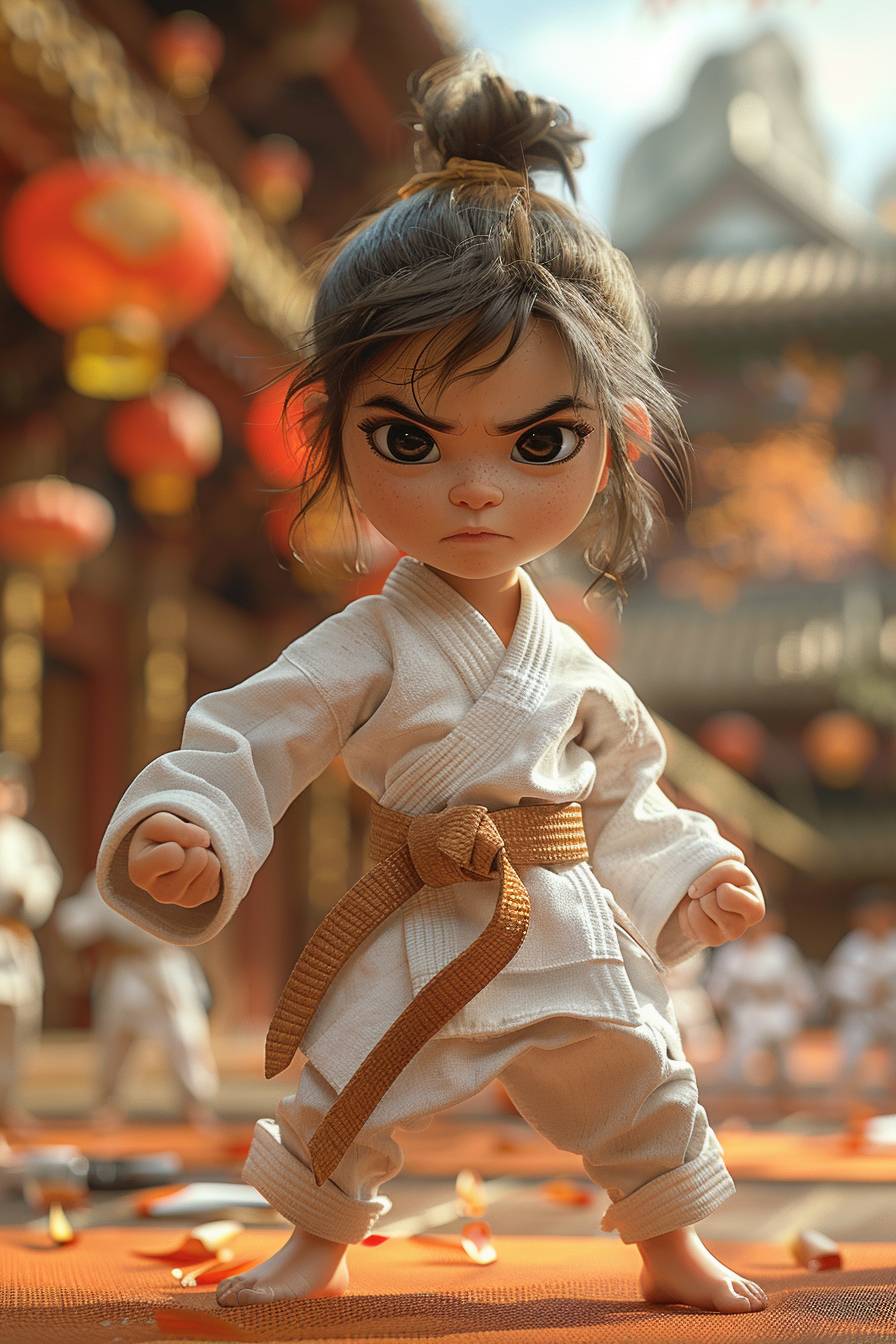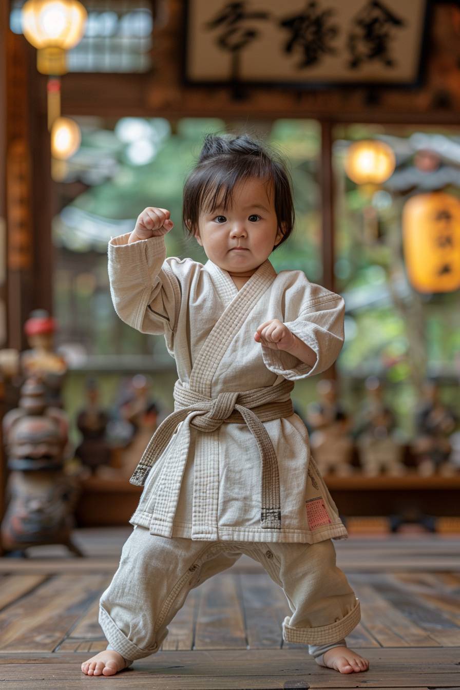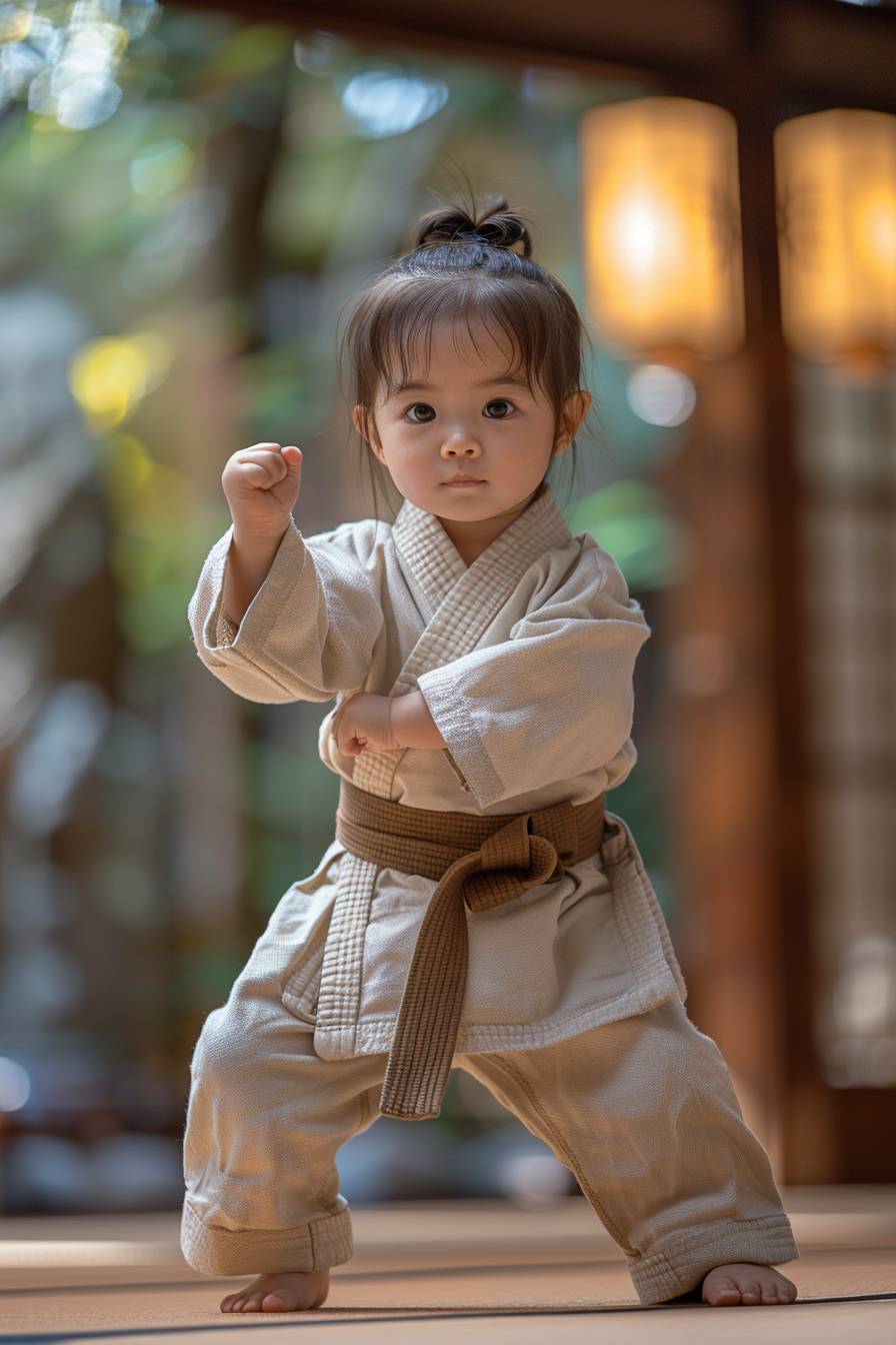 full body, fluffy, barefoot, colorful, high details, A serious Asian baby girl, is practicing Karate, With standard posture, wide-angle lens to capture, Dojo, Full Length Shot(FLS), third-person perspective, Front view, sung kim, darkbrown, movie lights, kevin hill, george lucas --ar 2:3 --stylize 750 --v 6.0