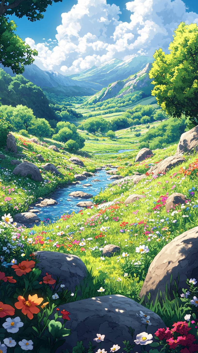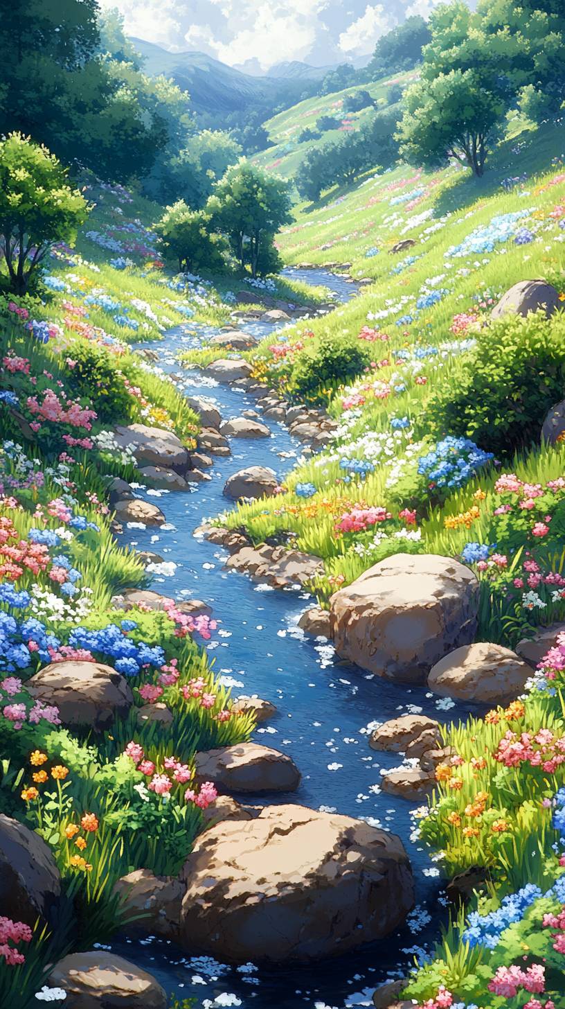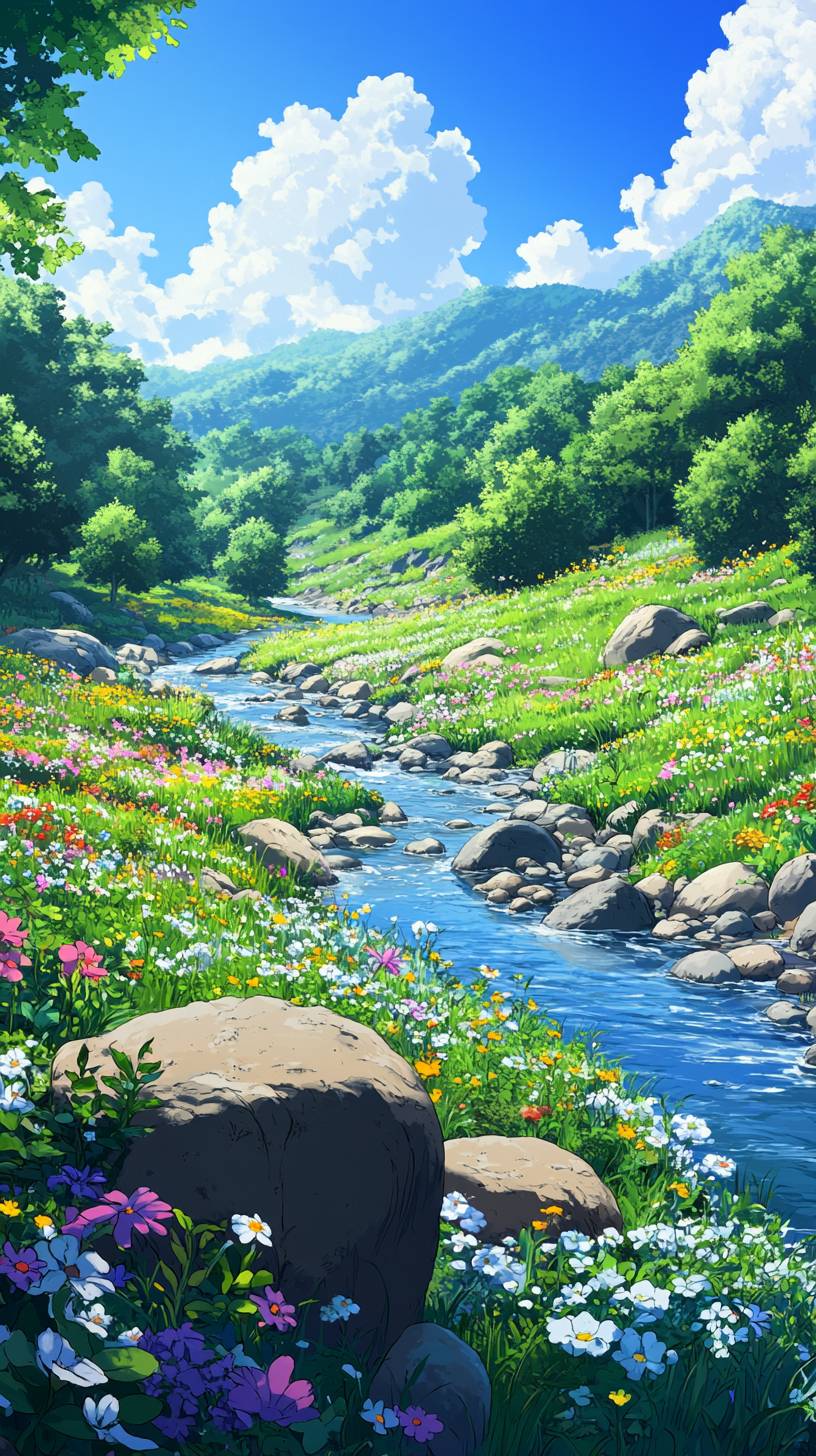 A high-resolution Ghibli-style scene set in the Pokémon world’s meadow. The meadow spans up to 100 meters ahead, with scattered rocks and bushes positioned naturally as hiding spots for Pokémon. A gentle river flows quietly, while wildflowers color the grassland, all bathed in soft natural light. The vibrant Pokémon colors blend seamlessly with the hand-drawn Ghibli touch, evoking a sense of adventure and serenity. The meadow feels lively, as if Pokémon are hiding nearby. Pokémon meadow setting, Ghibli-style, high-resolution nature scene --no kimono --chaos 10 --ar 9:16 --style raw --stylize 400 --v 6.1