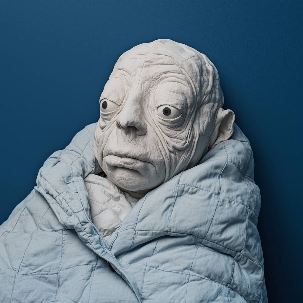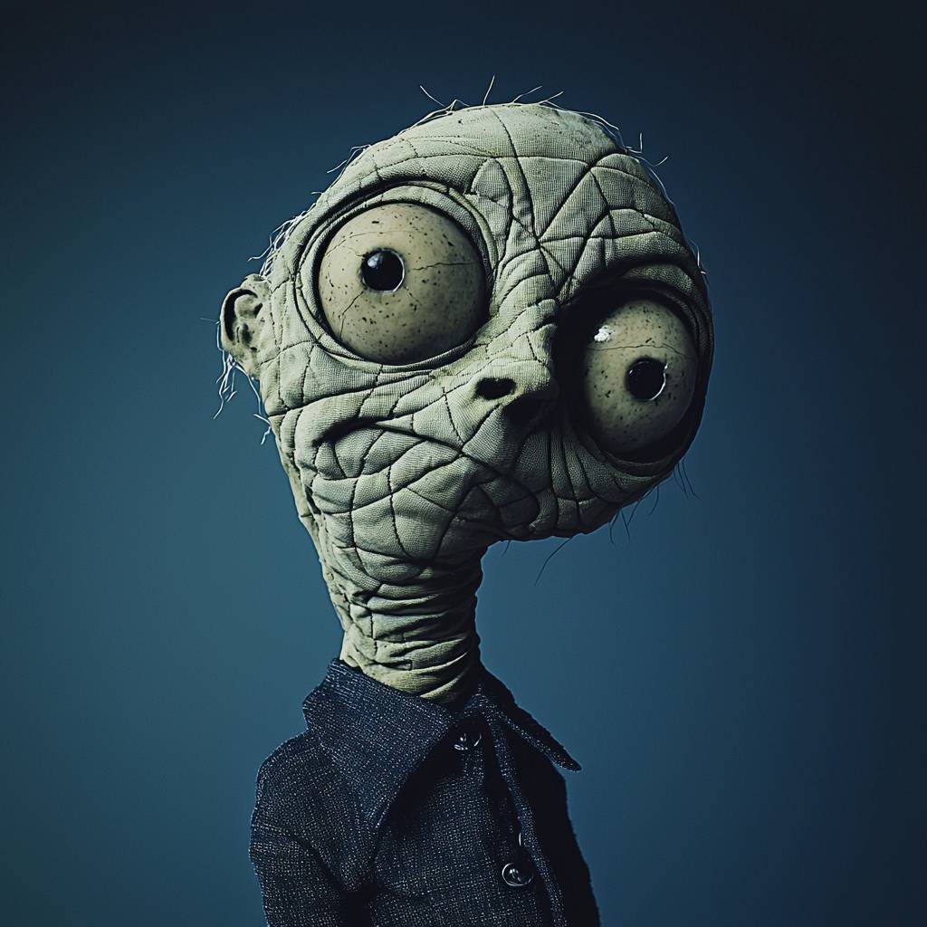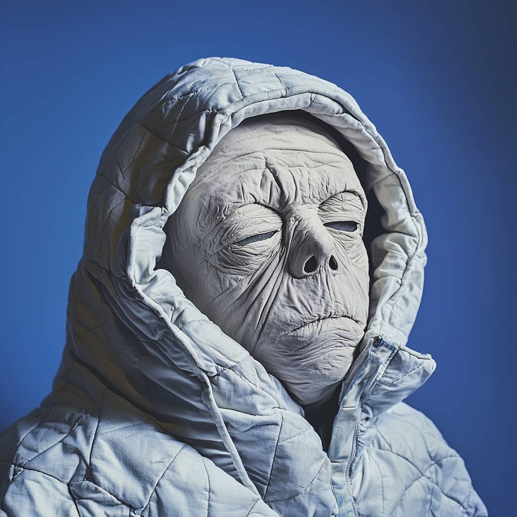 a photo on a solid blue colored background of a strange creepy puppet made from quilted duvet material who looks calm and sleepy, and the image is asymmetrical, off-center, dutch-angle, the image is photo-real, detailed, authentic, life-like, hyperrealistic, shot on an Alexa 65 large format camera, with a 25mm wide-lens, bokeh, DOF, --ar 1:1 --quality 2 --style raw --v 6.1