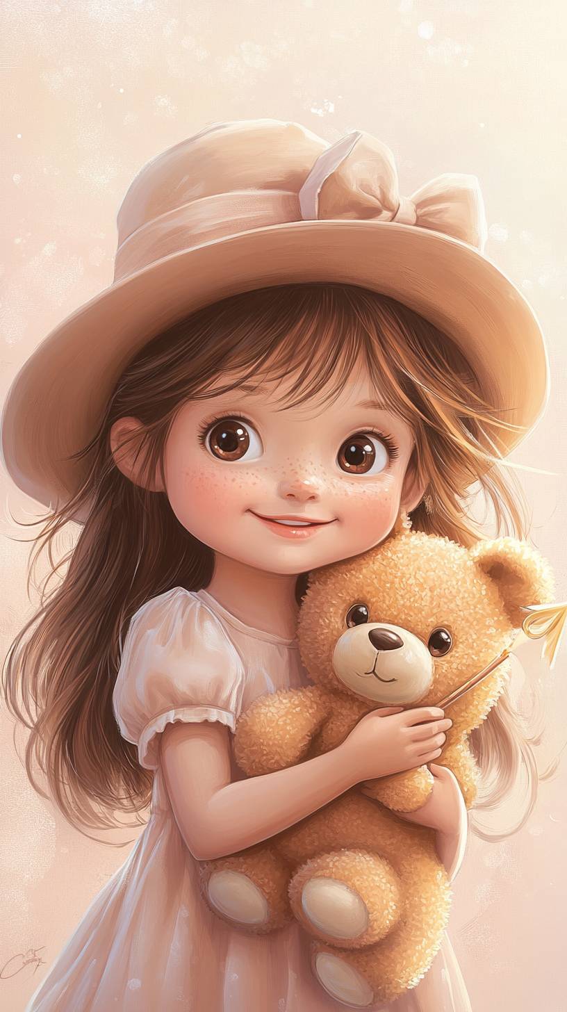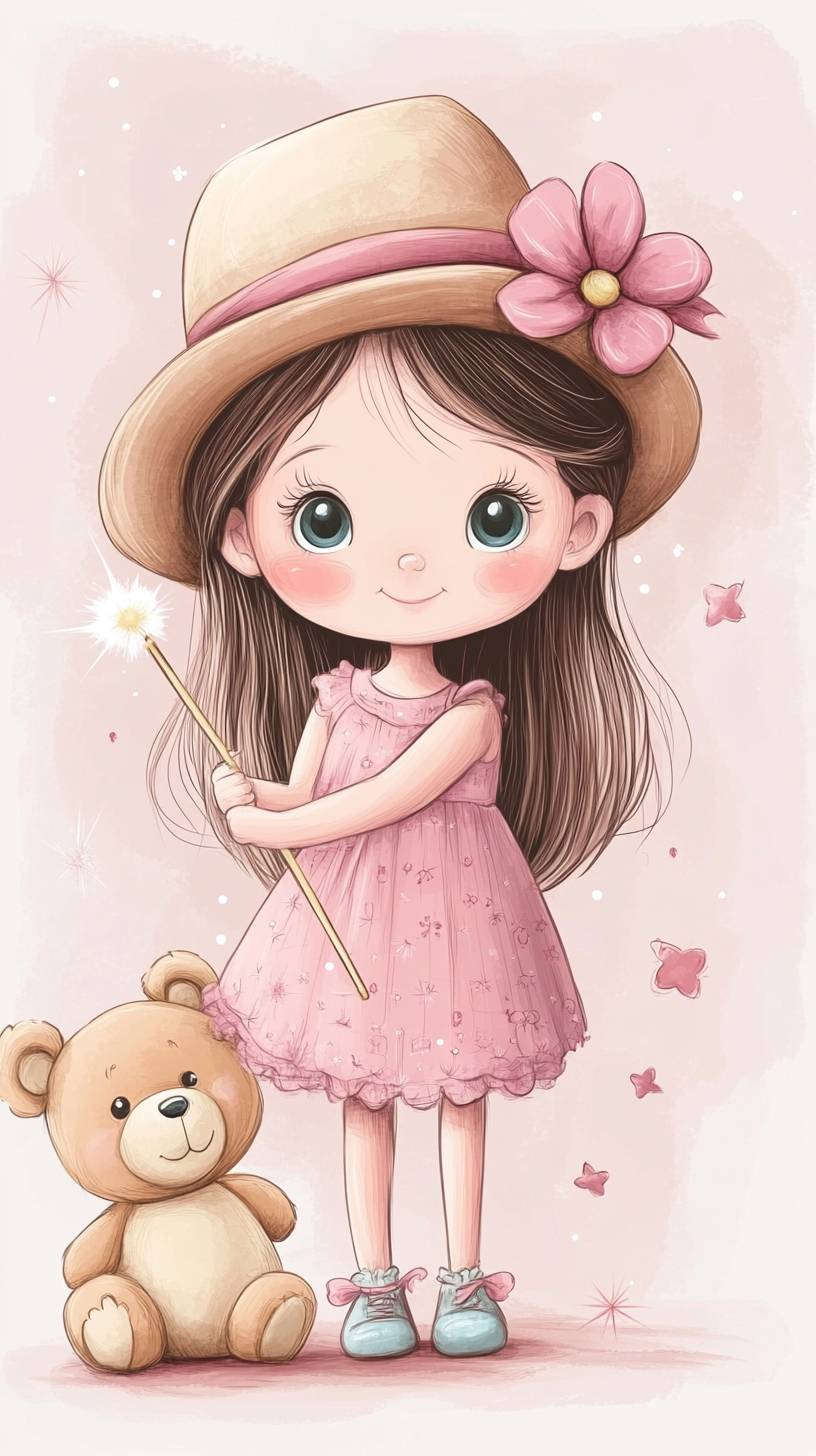 芭比娃娃,可愛的女孩,泰迪熊,魔法棒,卡通風格,適合女孩,淺粉色背景,高質量。