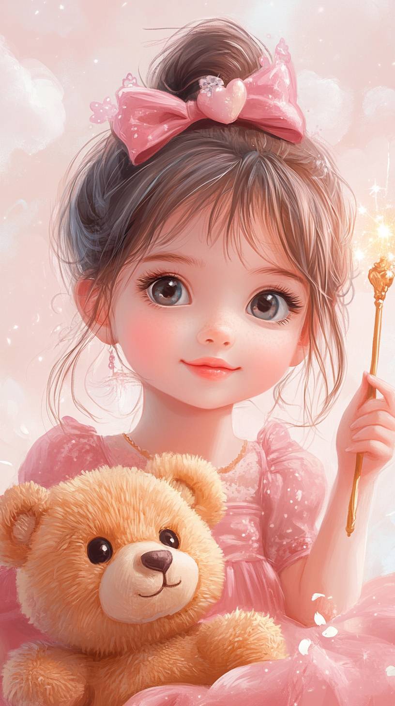 Barbie doll, cute girl, teddy bear, magic wand, cartoon style, suitable for girls, light pink background, high quality. --ar 9:16 --stylize 250 --v 6.1