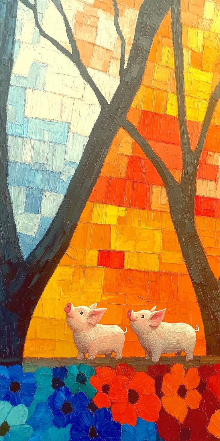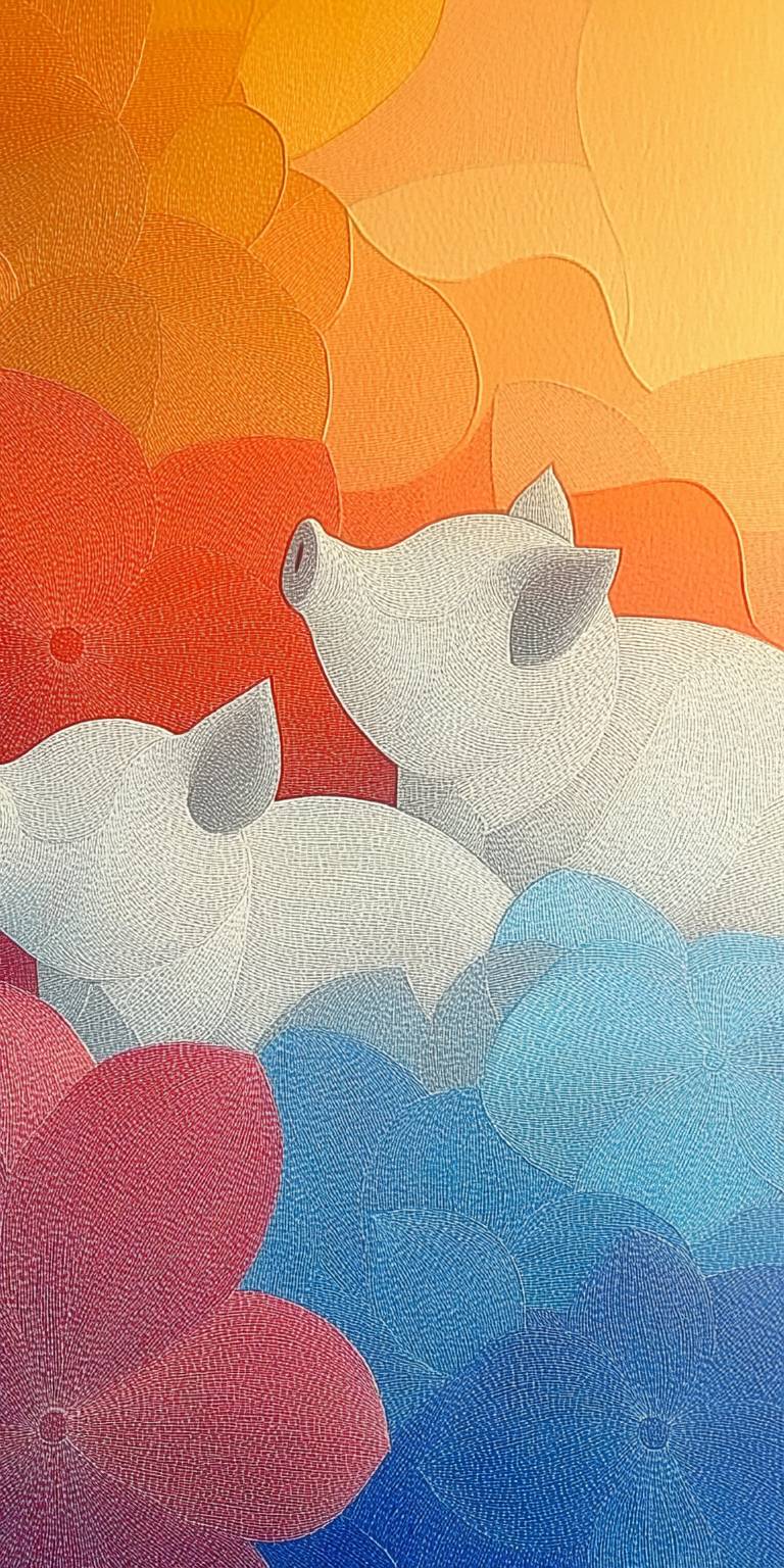 聰慧的小豬仔思考和平、人民、五彩花卉以及完美的點彩畫風。顏色有橙色、紅色、紫色和藍色。