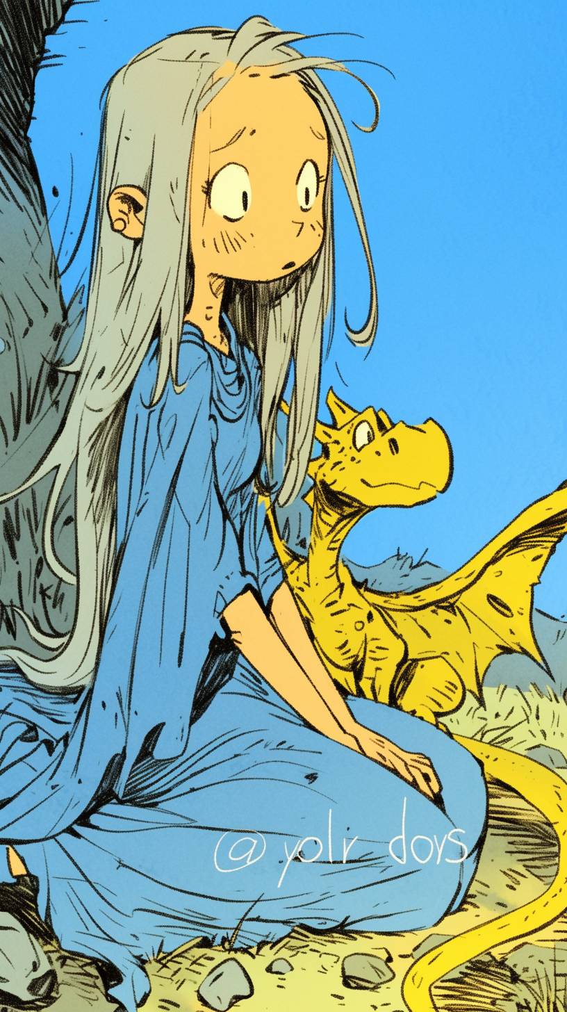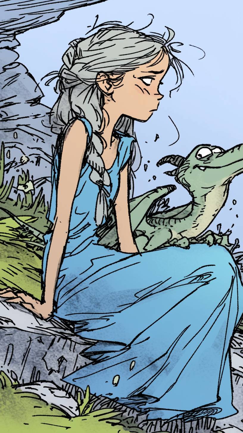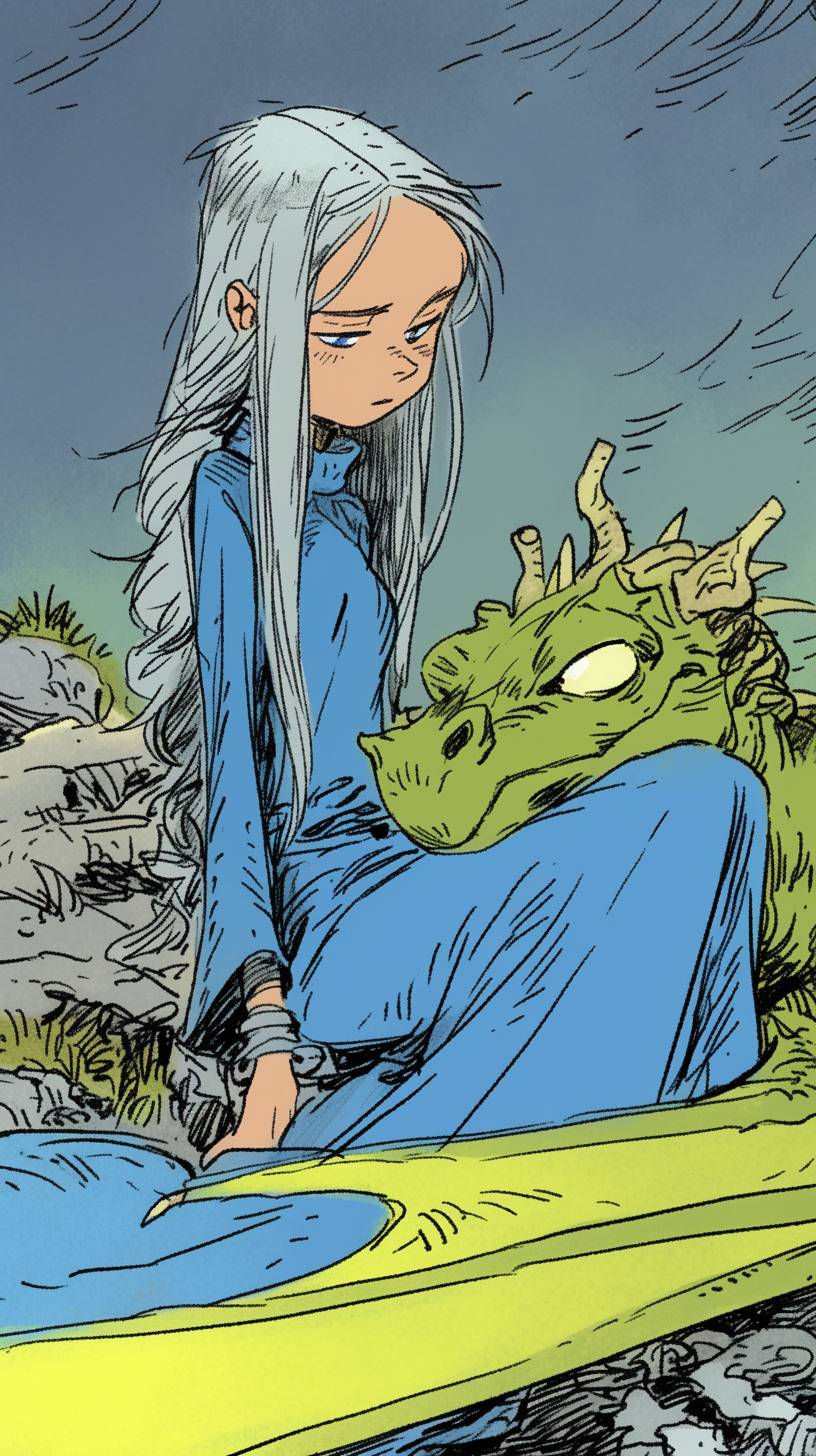 一位年輕女子,長長的銀髮和堅定的表情,坐在一條小龍旁邊,這條小龍有著大大的、富有表情的眼睛。女子穿著一襲流動的藍色裙子,而小龍則呈現出鮮豔的綠色。背景細節簡單,只有一些零散的岩石和草叢。畫風簡約,風格類似於Allie Brosh的作品,以簡單的線條、平坦的色彩和原始粗糙的感覺為特點。整體調調生動、質樸,捕捉著簡單和情感的感覺。