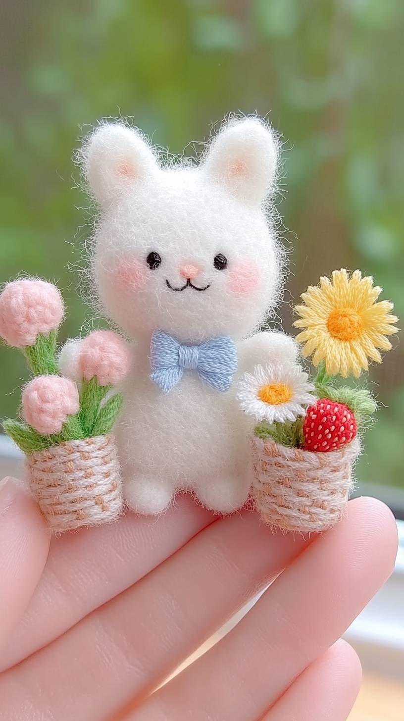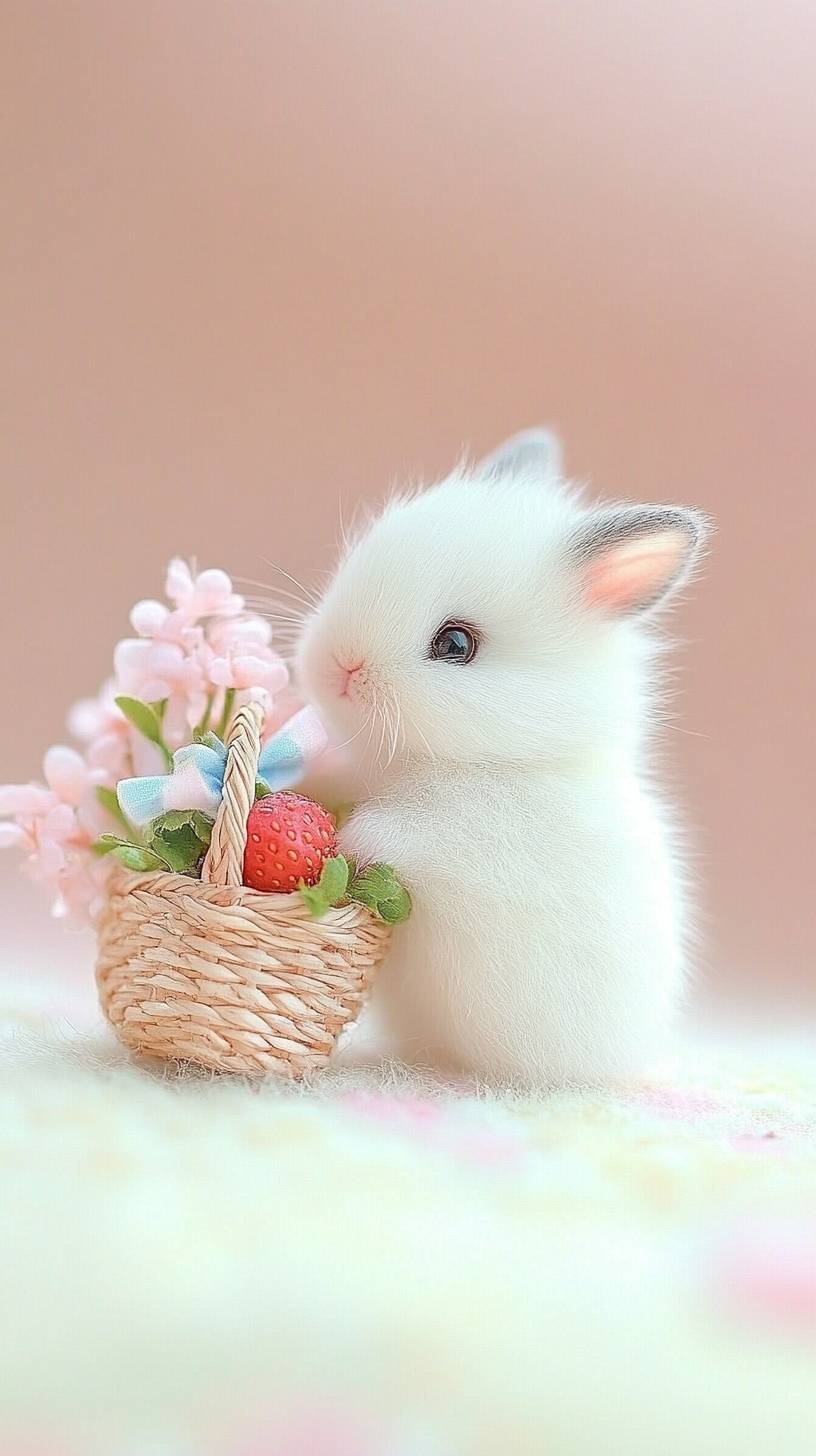 這個世界上最小的兩隻白色迷你長毛兔,有黑色的耳朵。一隻小兔子帶著藍色的蝴蝶結和黑色的耳朵,正在提著一個草莓籃子。另一隻兔子戴著小黃領結,提著一個花籃,面帶微笑。黑色的耳朵,黑色的眼睛,粉白色格子蝴蝶結,柔軟細膩的羽毛幾乎可以觸摸到。美麗、可愛、迷人,在一個簡單的背景下,這個迷你奇蹟值得一看。