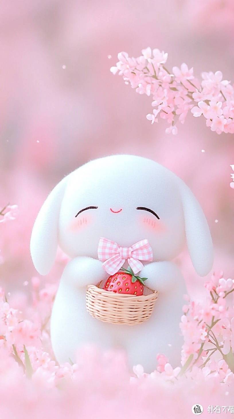 這是一隻世界上最小的白色長毛兔子,黑耳朵,帶藍色蝴蝶結,提著草莓籃,另一隻則帶著黃色領結,提著花籃,整體可愛迷人,值得一看。