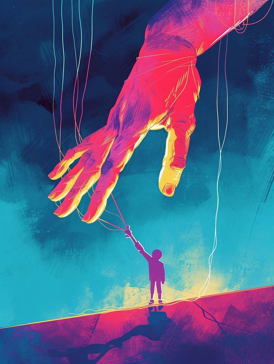 心靈控制,手握,大手偶戲,電線,兒童書插圖風格,簡單,可愛,滿色彩,光與影,平面色彩