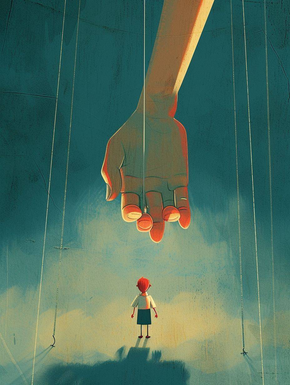 mind control, hand gripping, large hand puppeteer, wires, children's book illustration style, simple, cute, full color, light and shadow, flat color --ar 3:4 --v 6