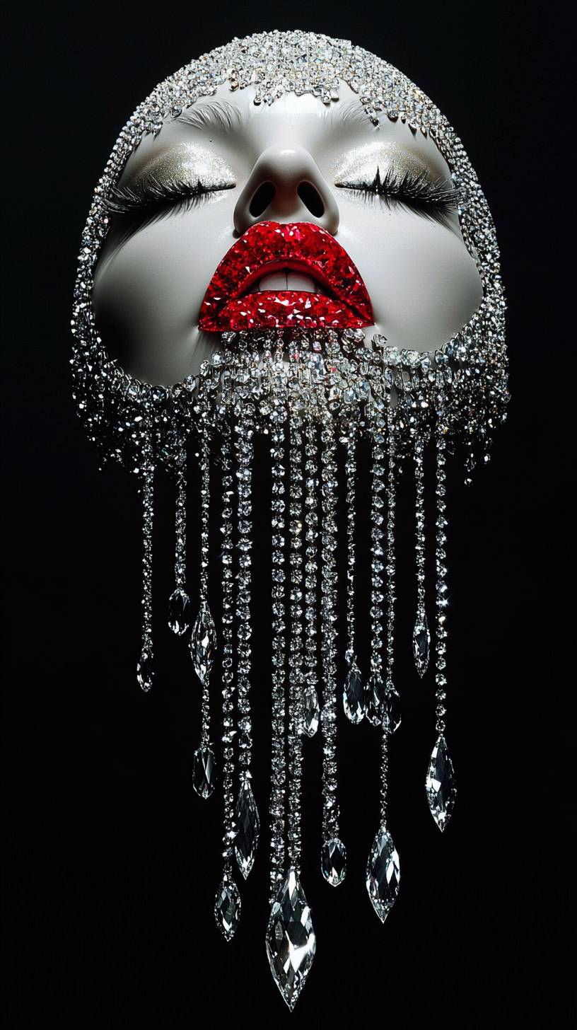 一張對稱的面孔,塗著紅色口紅,頭部被鏈條和鑽石覆蓋。嘴裡懸掛著水晶滴,滴落在她的下巴上,背景是黑色的。照片現實主義技法創造出閃亮、光滑的效果。這幅圖像採用Patrick Demarchelier的風格,體現了閃亮核心和Y2K美學,配有超大物體。