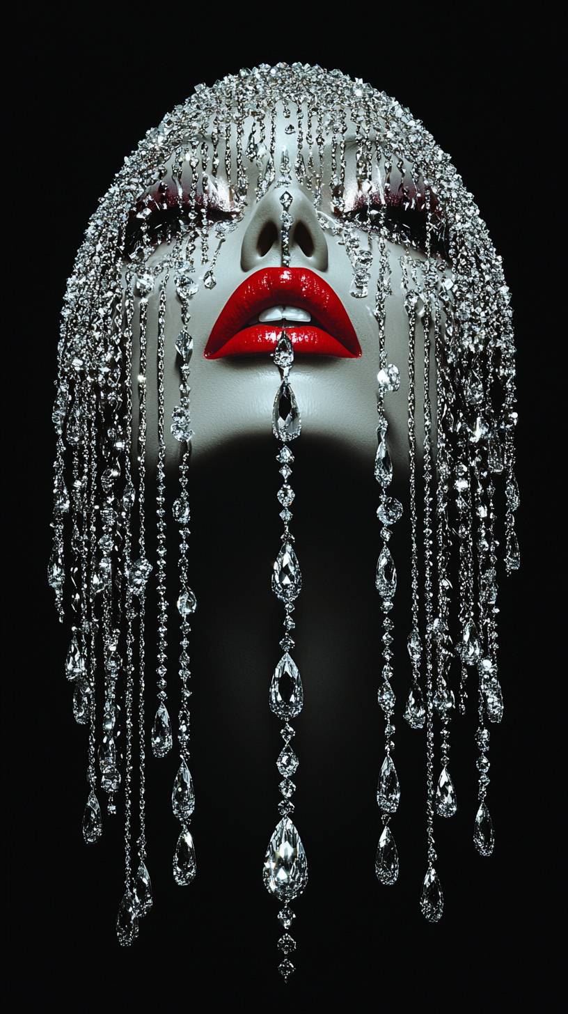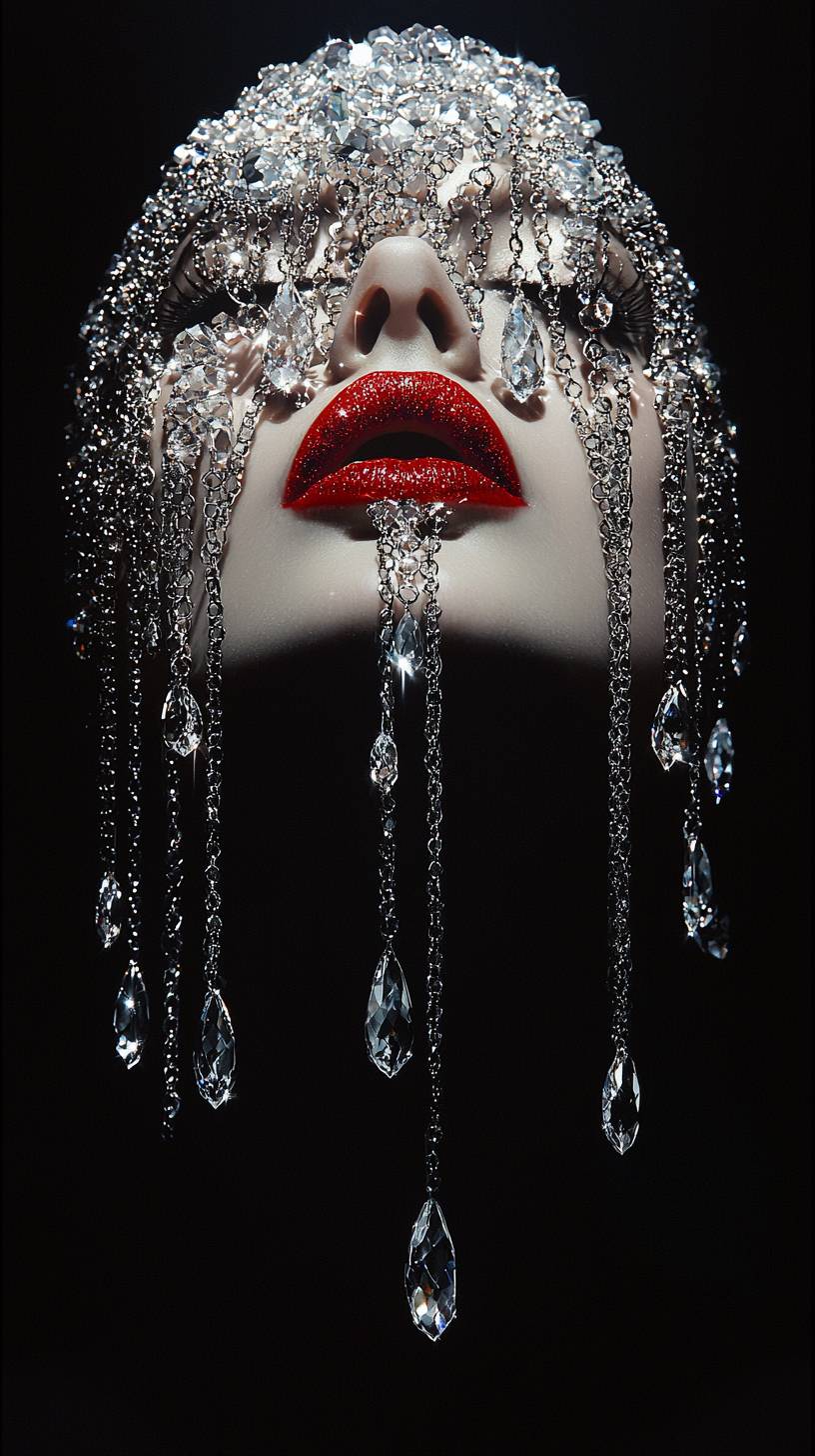 A symmetrical face with red lipstick, the head is covered in chains and diamonds. Hanging from its mouth are crystal drops dripping down her chin, against a black background. Photo-realistic techniques create a shiny, glossy effect. In the style of Patrick Demarchelier, this image embodies a glittercore, y2k aesthetic with oversized objects. --ar 9:16 --quality 2 --v 6.1