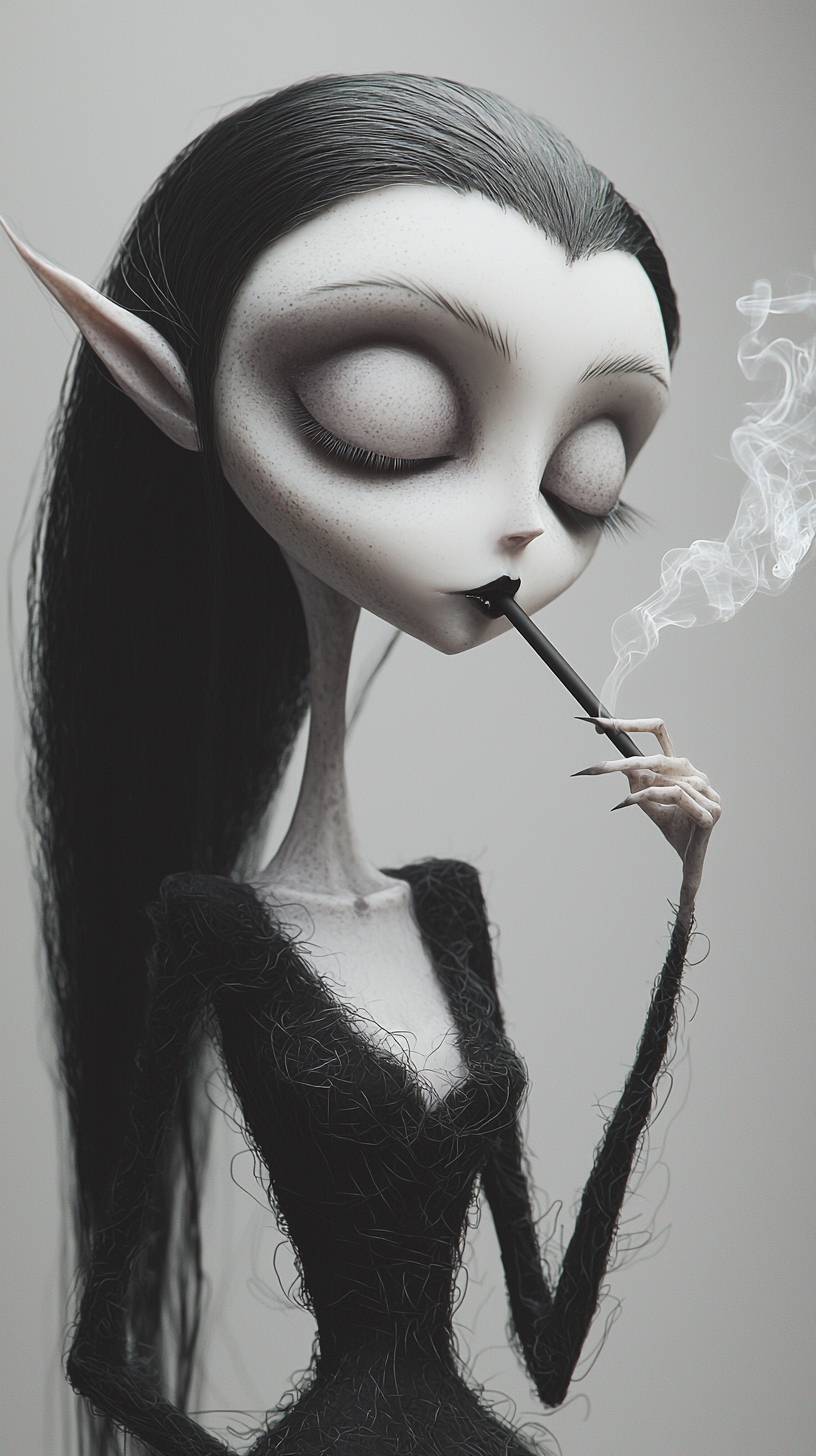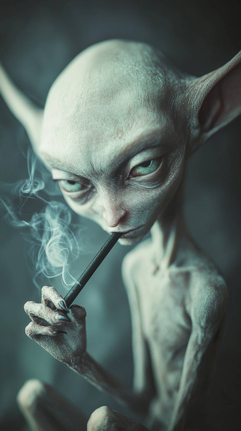 extremely attractive skinny elf, smoking a long black cigarette, long face, long nose, large almond shaped eyes, skinny flat body --ar 9:16 --quality 2 --style raw --personalize whhuoo1 --stylize 50 --v 6.1