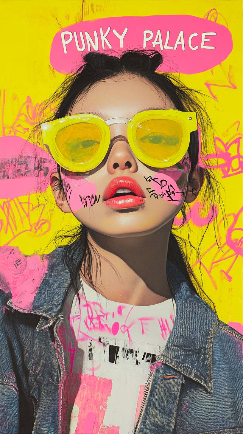 一幅巴洛克風格的肖像畫,描繪了一位美麗的亞洲女性,佩戴著太陽眼鏡,畫面上覆蓋著鮮豔的黃色塗鴉和標籤式的標記,粉紅色塗鴉文字寫著「朋克宮殿」,結合了以上元素,暗黑學術風格,明顯的畫筆痕跡。