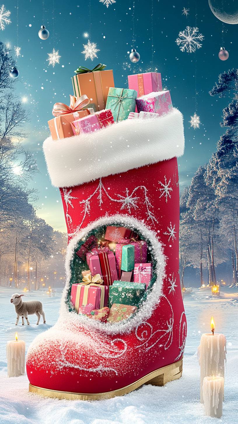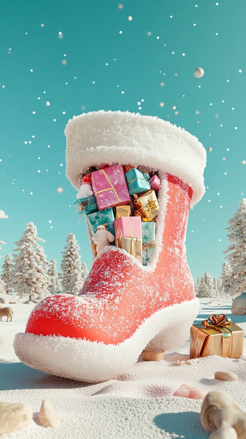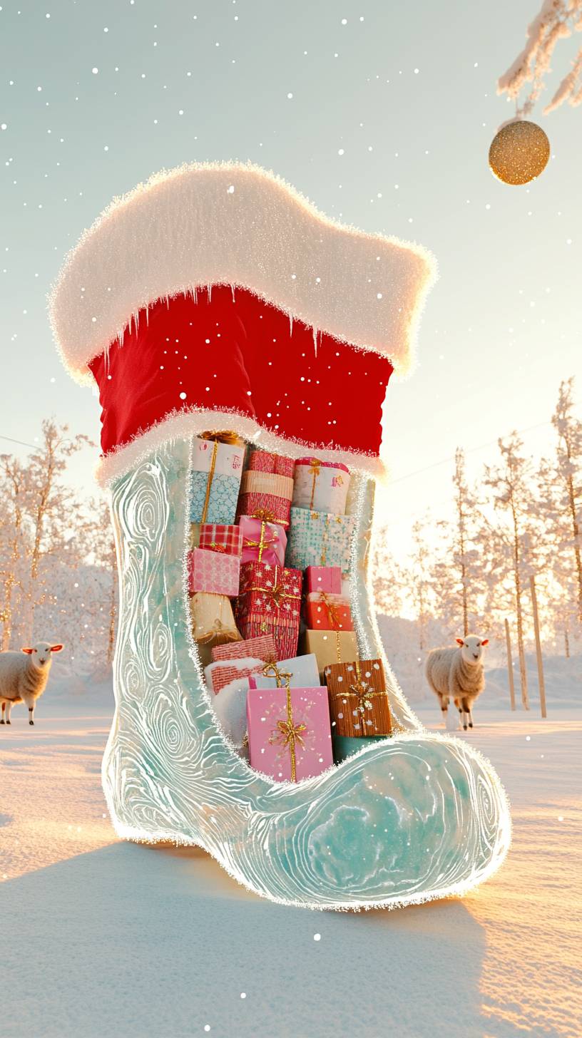 Large glittering sparkling santa boot filled with many different gifts house frost metasequoia in the snow, frost shaped like a decorated santa boot, with wrapped gifts, fairy lights and twinkling stars, many beautiful and wavy continuous lines in the snow, Christmas atmosphere, clean clarity high background snow covered trees, a lamb family walking through the snowy forest, frost hanging ice, impressive composition, endless snow, morning, view, super wide angle, heavy snow, high detail, film lighting, virtual engine, film quality, octane rendering, super high definition, candles, mistletoe, extraordinary fairy tale image, cobalt blue, ochre, pink, pistachio green, gemstones, marbled design, crystal, metal, gold, polished geode, background with surreal glittering polished geode mountains, glittering polished geode rocks and colorful geodes, gemstones, marbled design, crystal, metal, gold, polished geode, background with surreal glittering polished geode mountains, glittering polished geode rocks and brightly lit moon in the sky, OD ultra-high-definition rendering, 8K --no text --chaos 10 --ar 9:16 --style raw --personalize lmrmr8c --stylize 500 --v 6.1