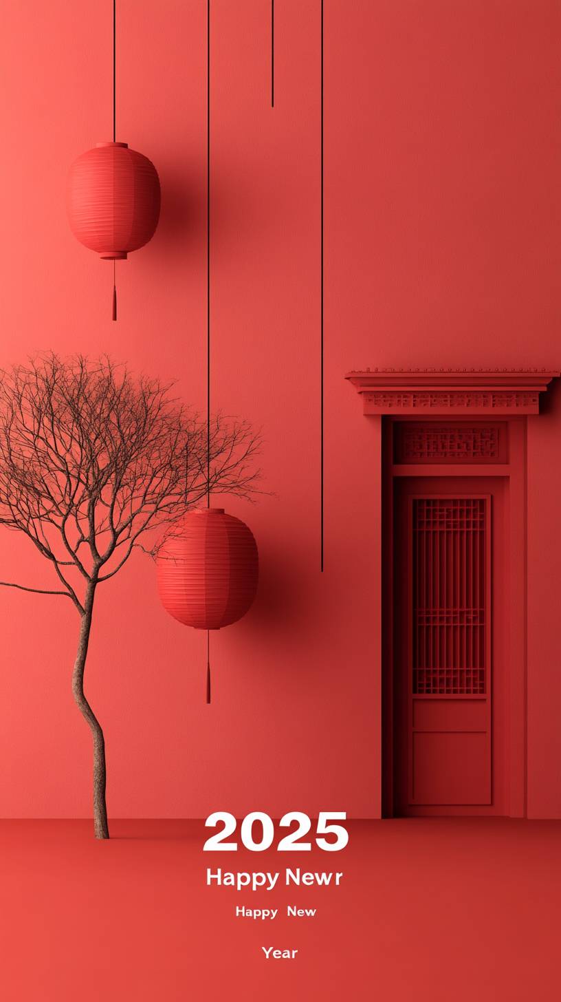 2025 3D渲染,字樣“2025”用古典中國紅燈籠和紅色古建築構成,下面是一行小字“新年快樂”,白色背景,極簡風格,簡單設計,高分辨率攝影。