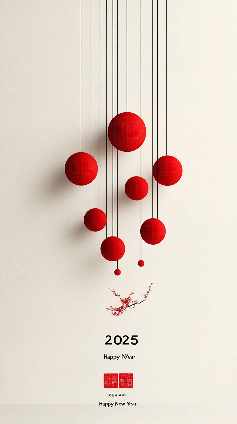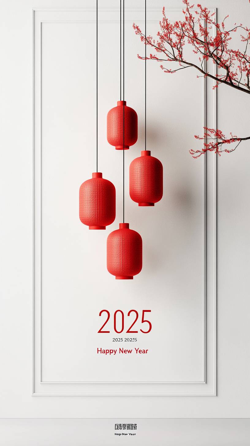 "2025" 3D rendering, with the word "2025" in ancient Chinese red lanterns and red ancient Chinese buildings, and a row of small words "Happy New Year" below, white background, minimalist, simple design, high-resolution photography. --ar 9:16 --style raw --personalize 9t4r88j --stylize 750 --v 6.1