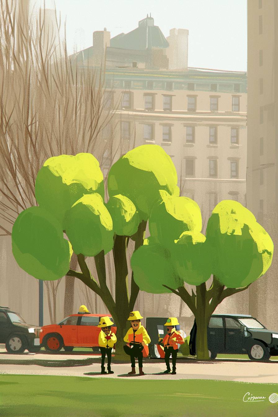 一群多元化的人士與人工智能技術互動,自動駕駛車輛在旁邊滑行,無人機正在送遞包裹。未來主義的賽博朋克風格,戶外繁忙的城市景觀在黃昏時分,街道旁是現代摩天大樓,附近有一個充滿活力的市場。燈光以霓虹燈為主,數字屏幕的柔和光輝和LED顯示的複雜圖案,色彩為電藍色和火紅色,氣氛充滿活力。構圖中間是一棵高聳的數字樹,上面有屏幕,人們聚集在一側的互動亭周圍,另一側自動駕駛車輛穿行,空中懸浮著全息廣告,反射玻璃建築的陰影和亮點無縫融合。