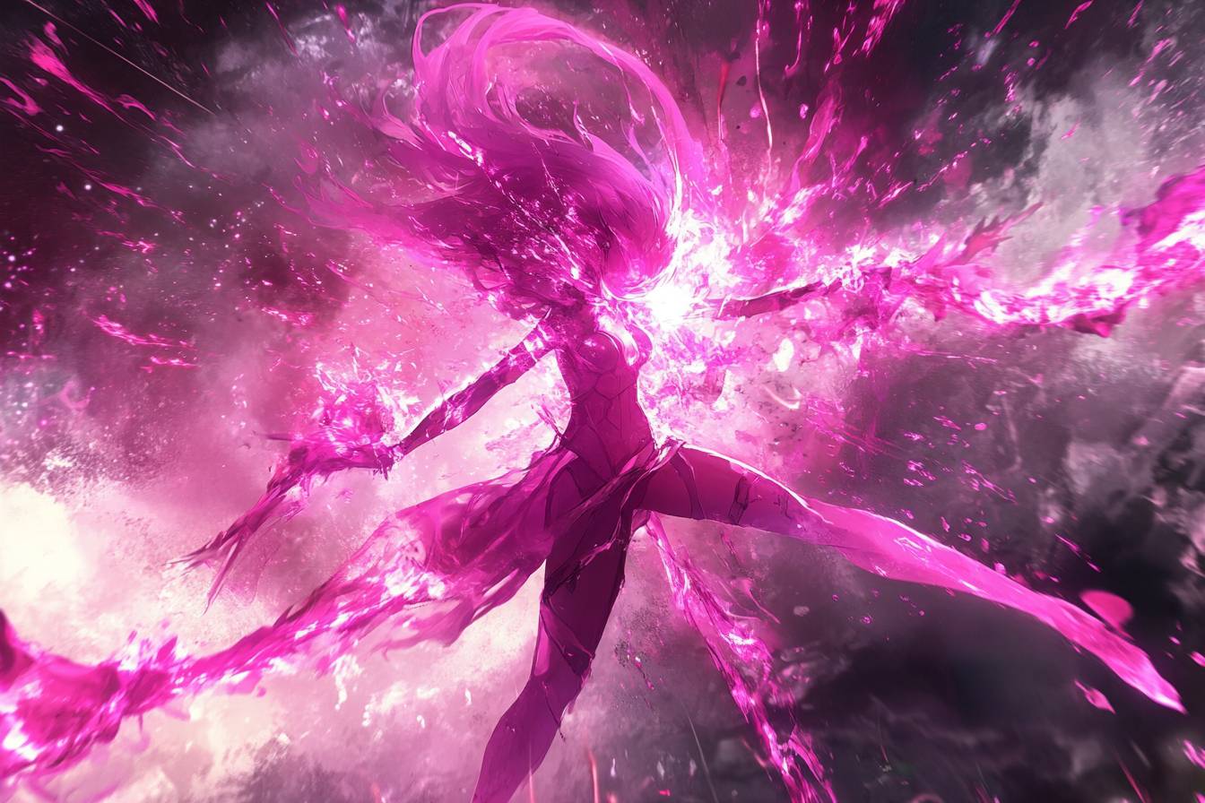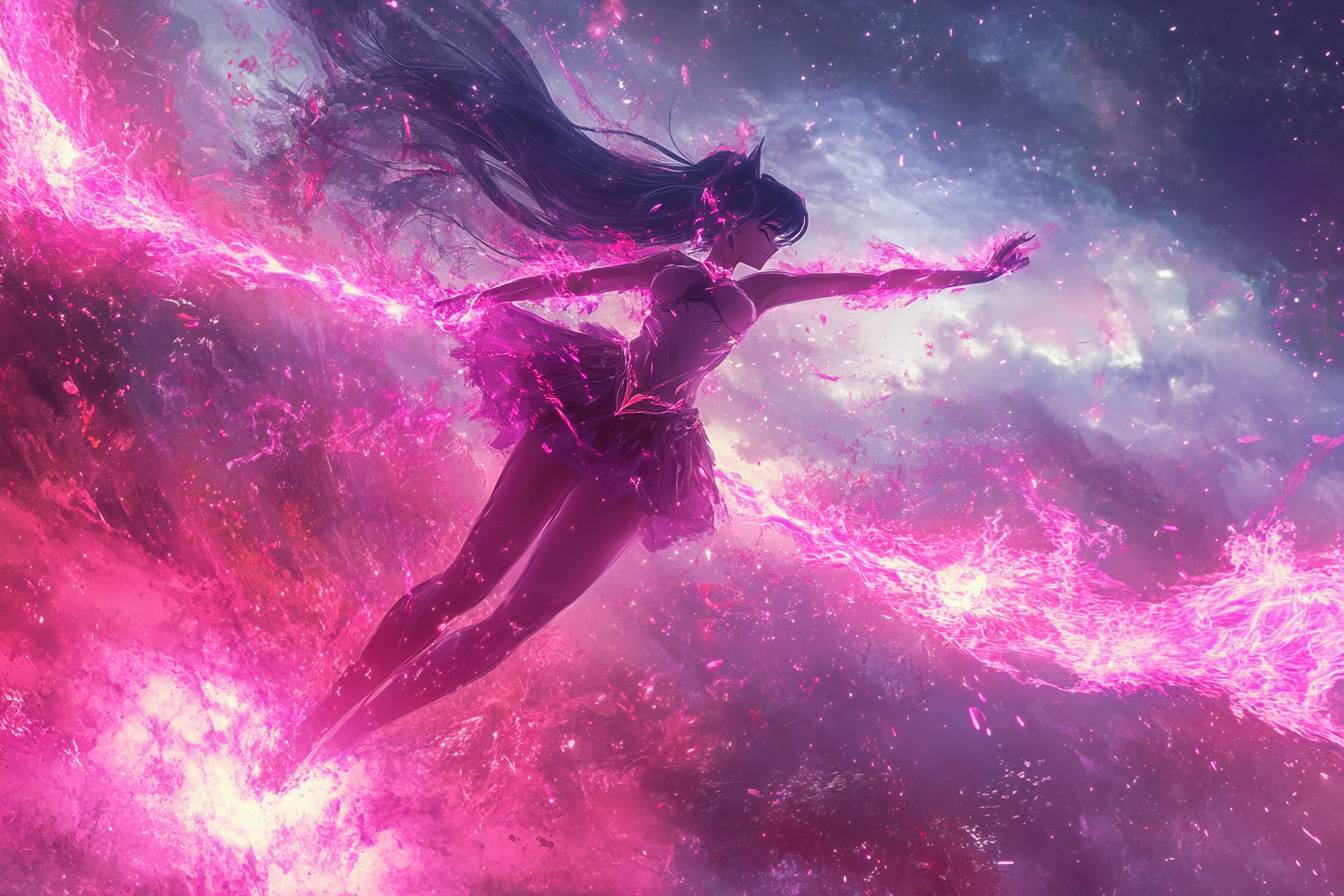 A Magical Girl depicted in a Shōnen Battle Aura Explosion, with dynamic action poses and energy effects. Utilize intense vibrant pink and pastel purple to represent powerful auras and special attacks. --ar 3:2