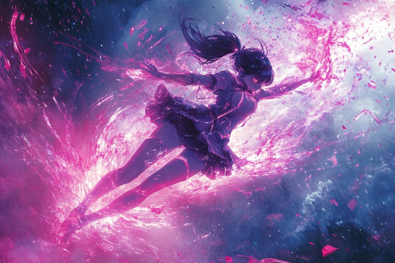 一位魔法少女在少年戰鬥氣場爆炸中描繪,展現出動態的動作姿勢和能量效果。運用強烈的鮮粉色和柔和的紫色來代表強大的氣場和特殊攻擊。