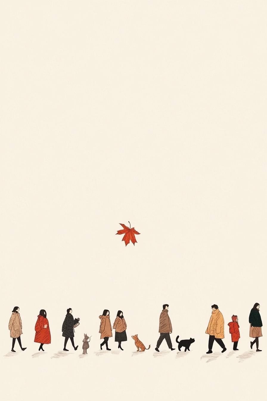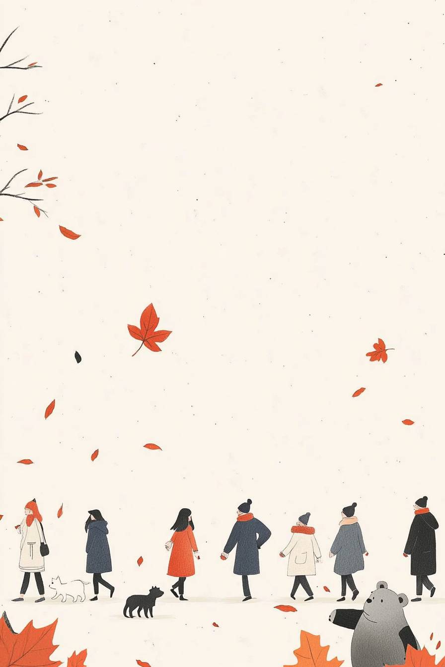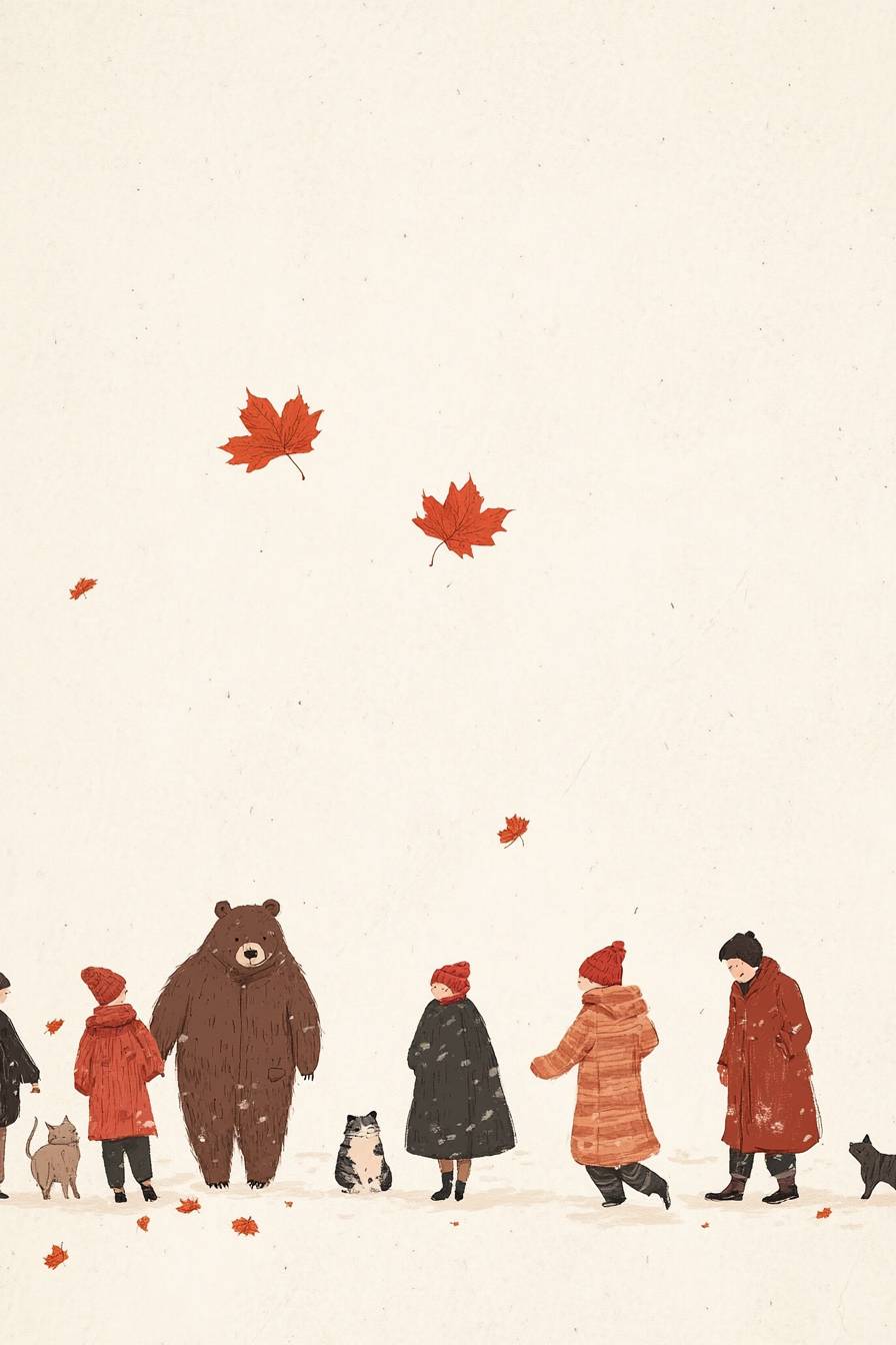 一幅極簡的手繪插圖,描繪了人們在街上行走,四周有貓和一隻巨大的熊。空中飄落著一片楓葉,大家都穿著用羊毛製成的秋季服裝,背景是簡單的淺米色。這是一幅簡單卻迷人的畫作,捕捉了簡單與溫暖。