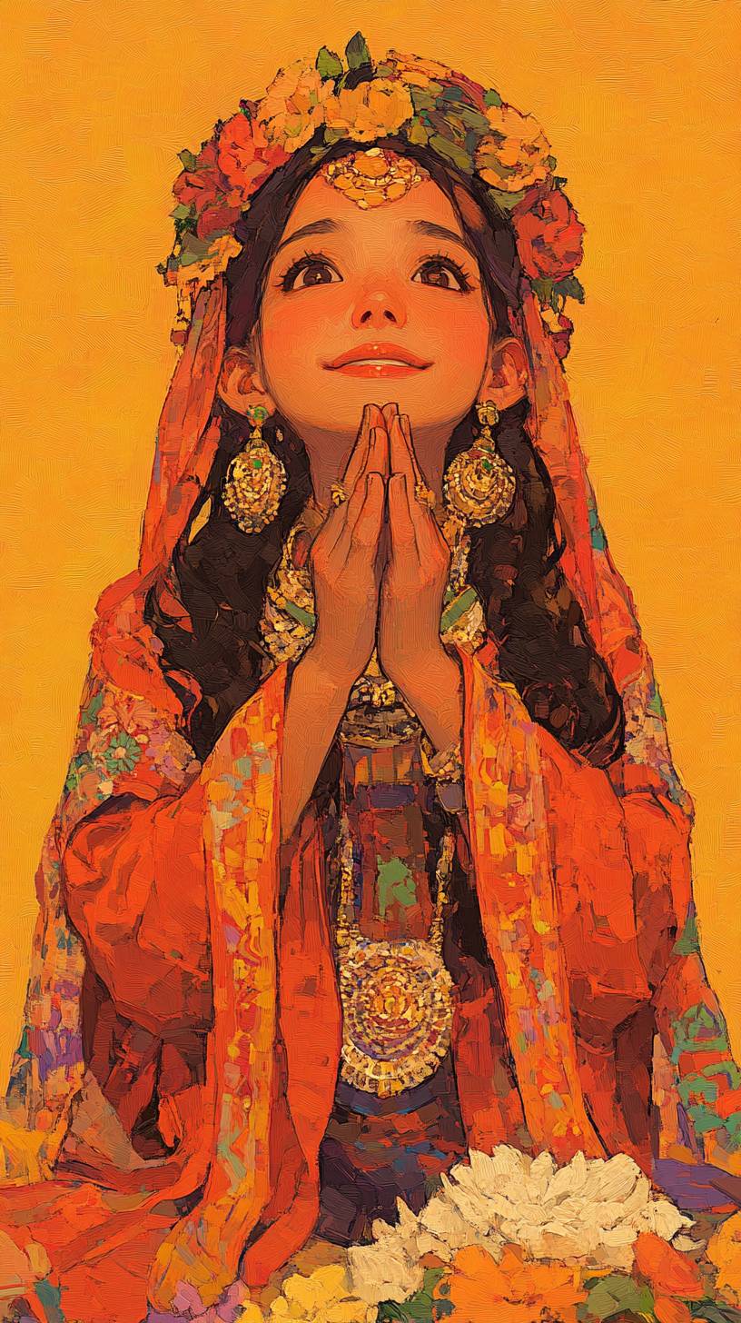一幅充滿情感的AI女孩肖像,穿著民族服飾,白髮,公正的肌膚,大眼睛。