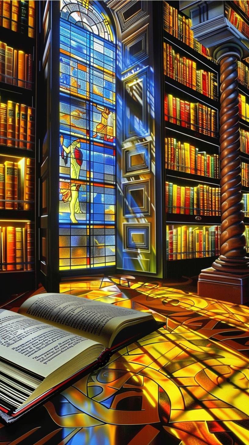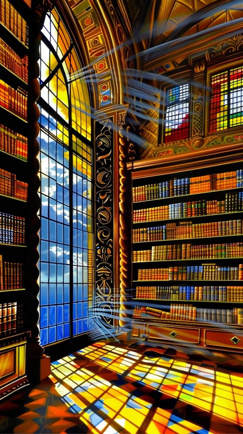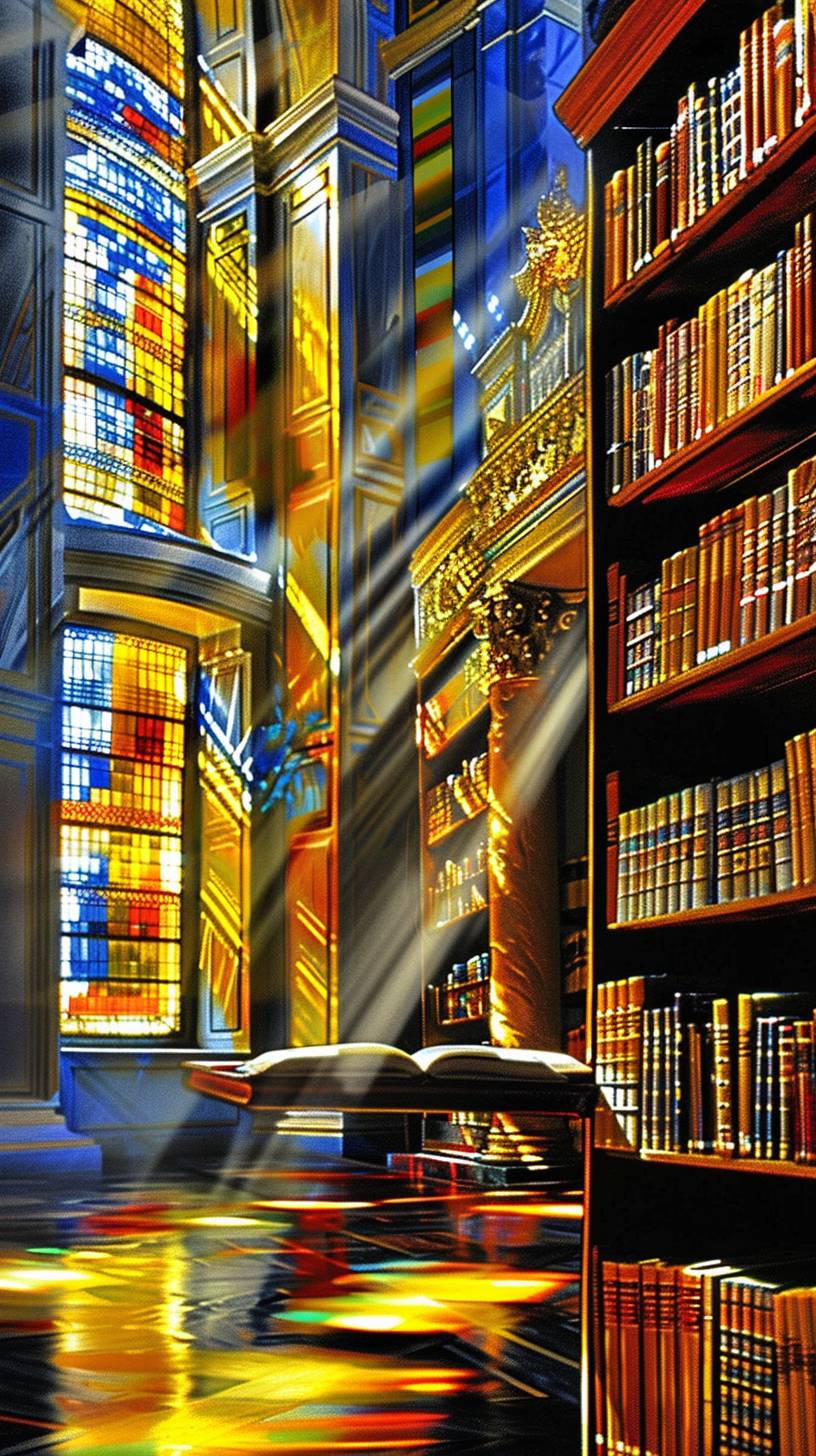 A historic library with tall bookshelves filled with ancient books. Sunlight streams through stained glass windows, illuminating the beauty of the space. In the style of an architectural photograph. --sref 2479941749 --ar 9:16 --v 6.0