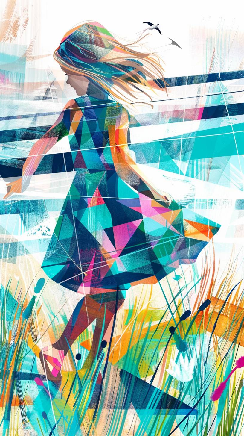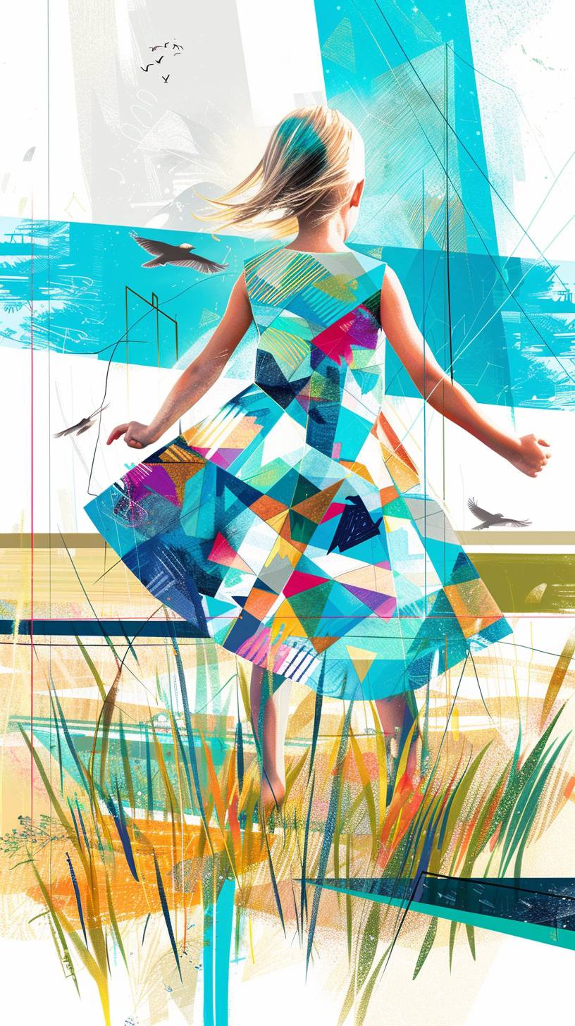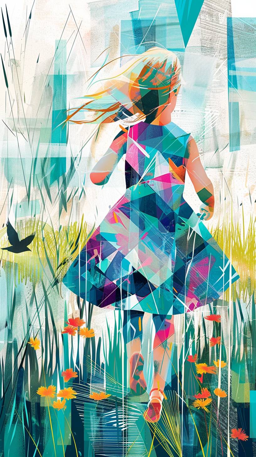 一個穿著色彩斑斕夏日連衣裙的小女孩,在野花的田野中旋轉。陽光明媚,鳥兒在歌唱。採用水彩畫風格。