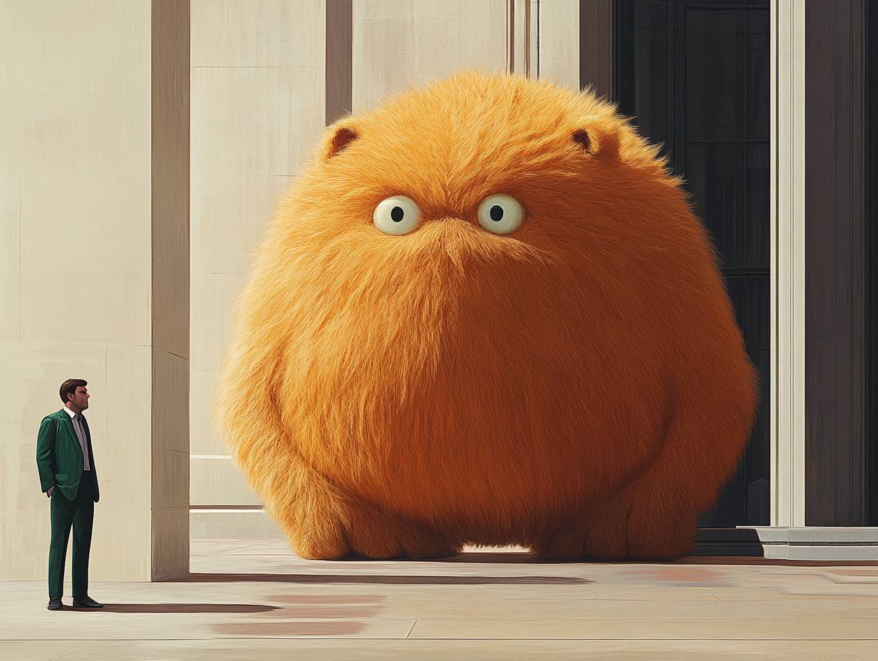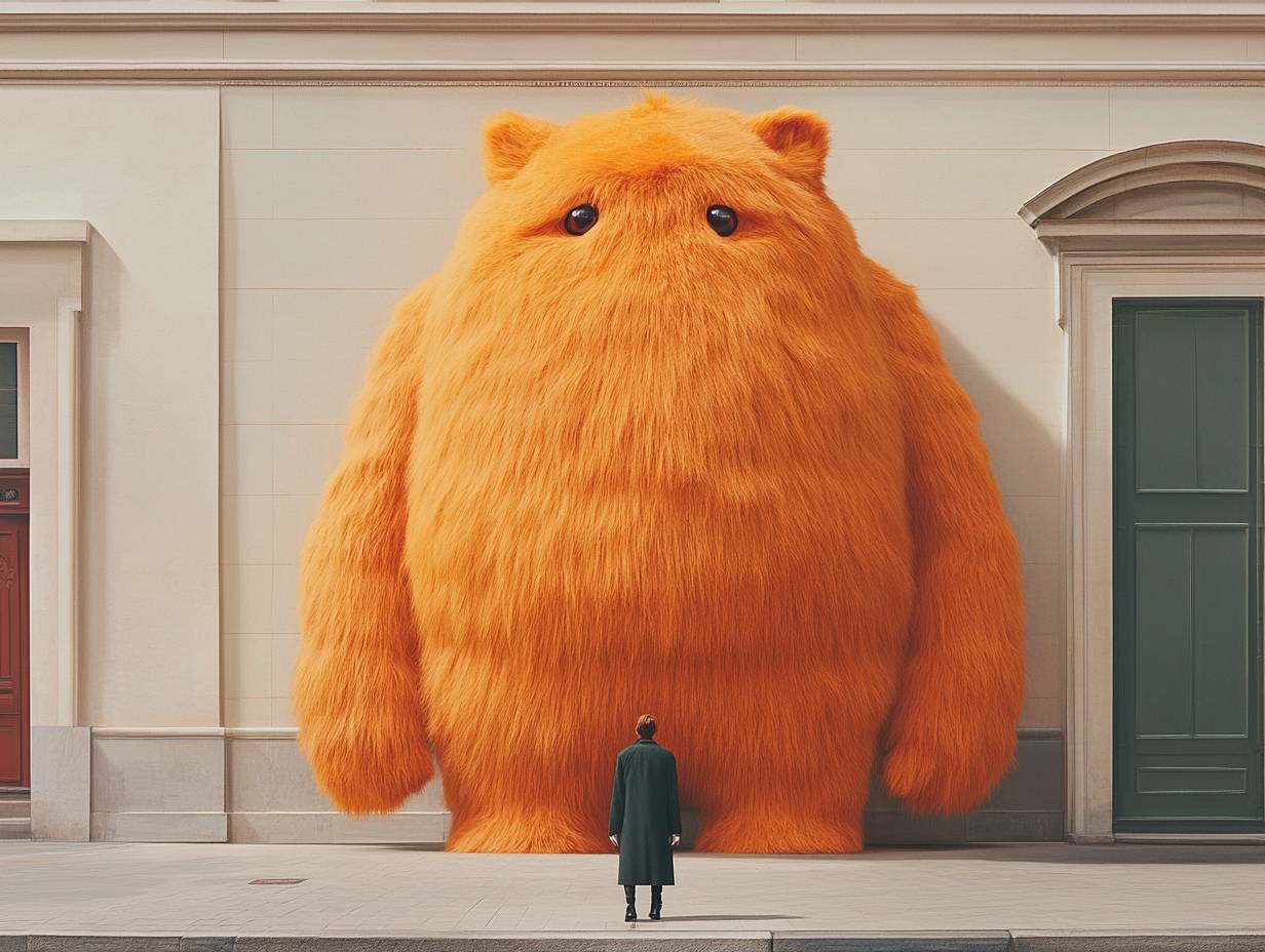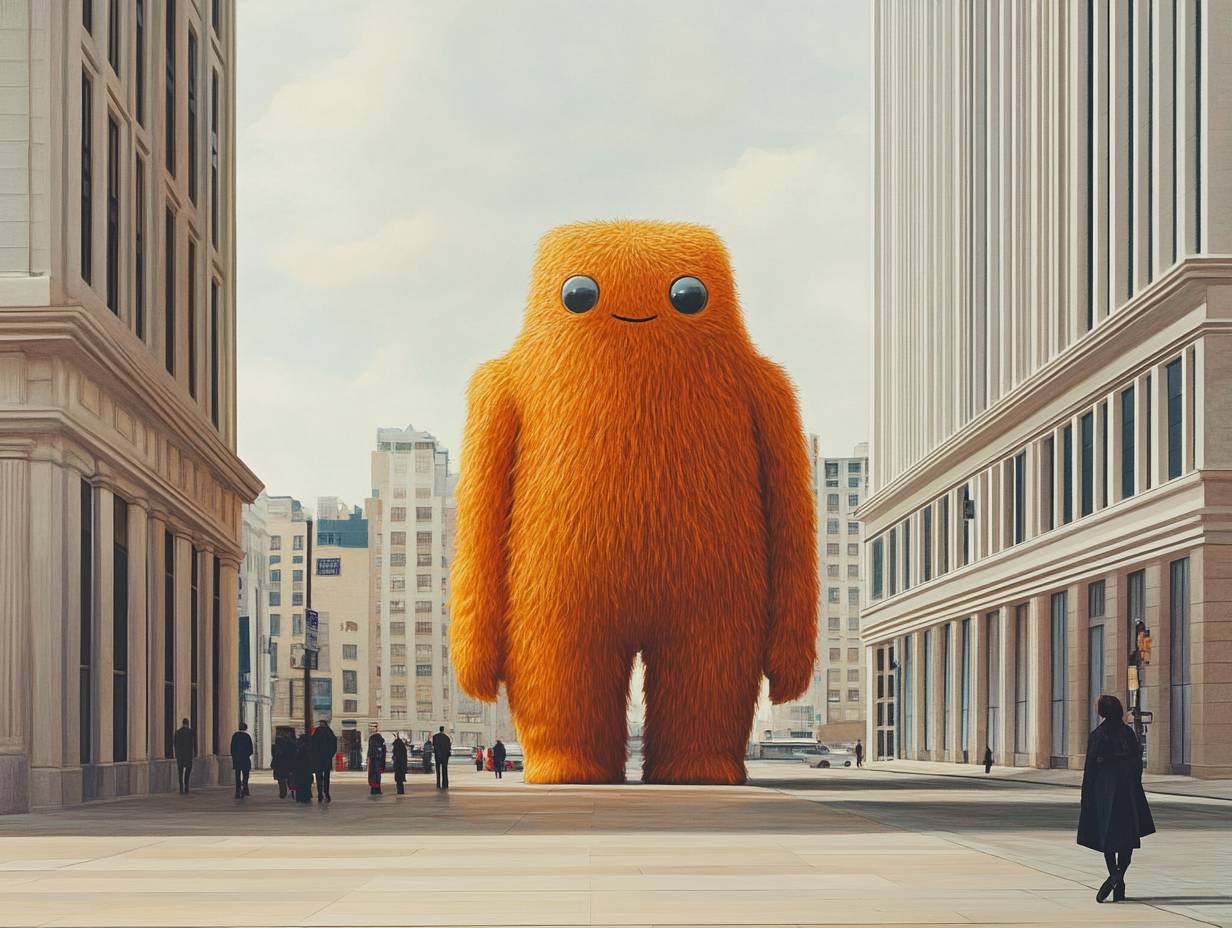 Giant cute furry fluffy round monster in the city --ar 4:3 --style raw --sref 4172525597 --sw 100 --stylize 300