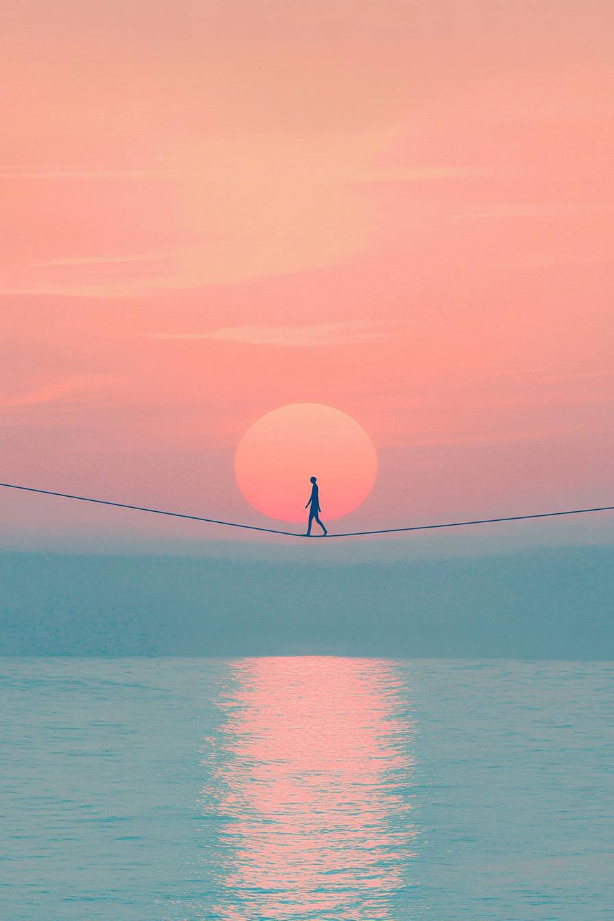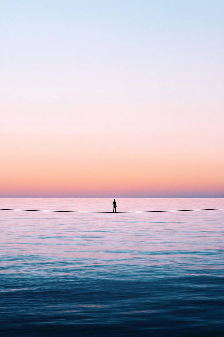 極簡主義瑞典線條藝術海報,畫面中有一個小人走在繩索上,繩索懸掛在廣闊的海洋上,背景是日落。