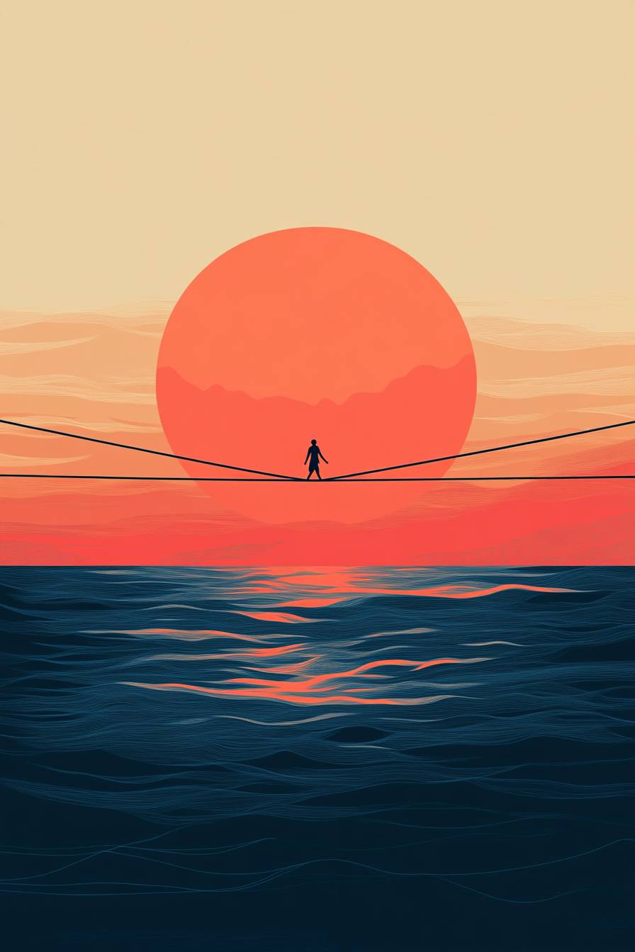 minimalistic swedish line art poster a small figure walking across a tightrope stretched over a vast ocean at sunset --ar 2:3 --v 6.1