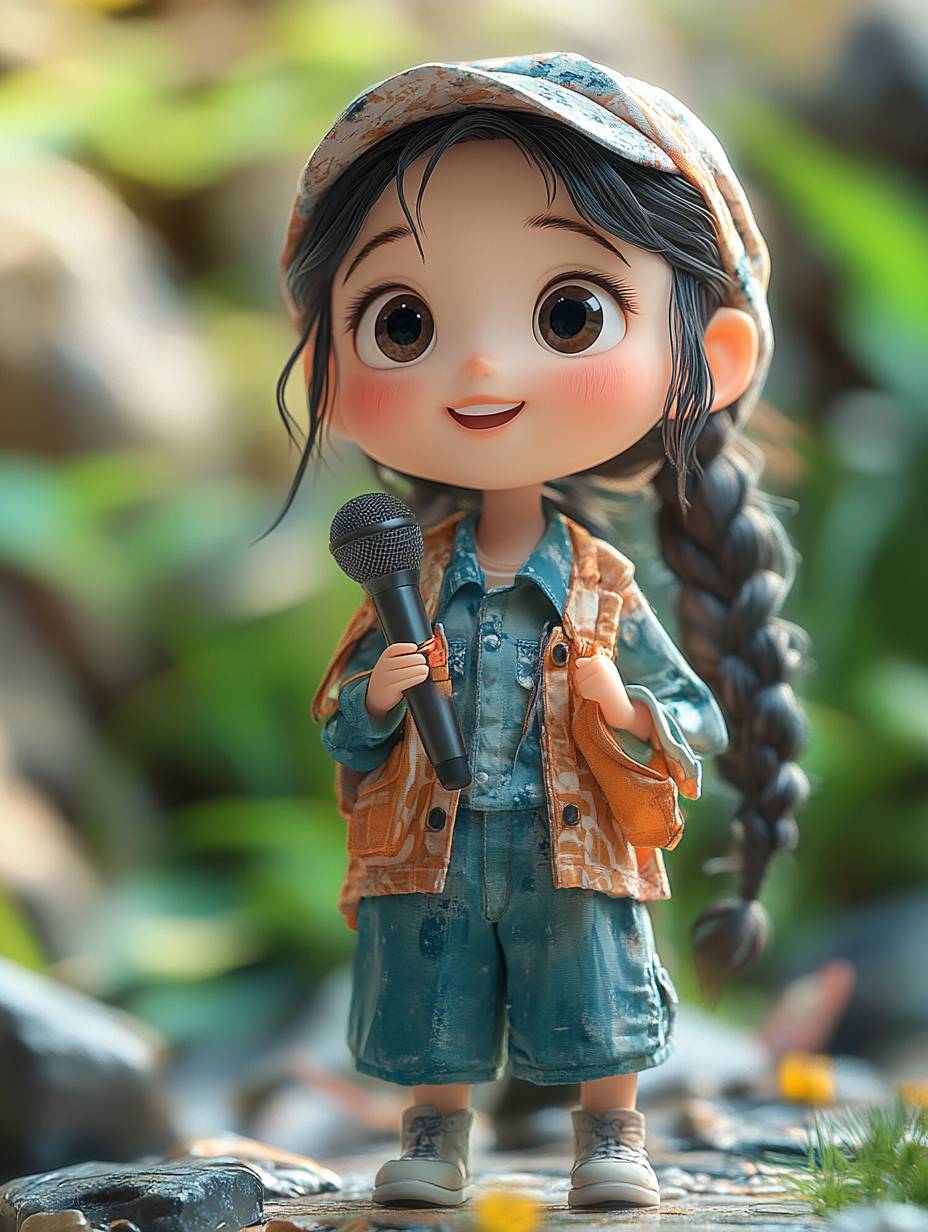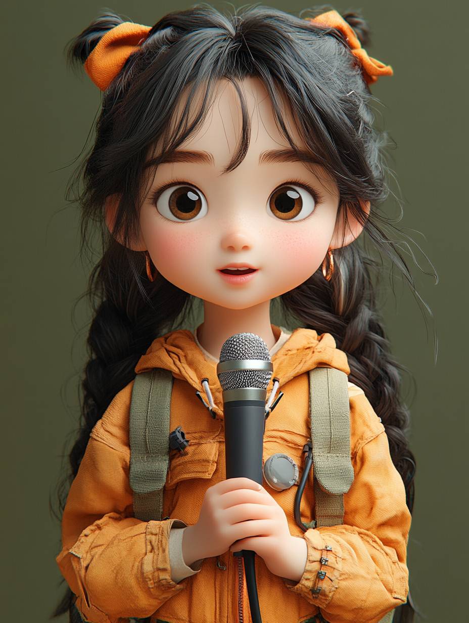 全身圖像,一個美麗的亞洲女孩,11歲,臉龐美麗,穿著時尚的現代夏季服裝,手裡拿著麥克風,是一個小記者,3D卡通風格和皮克斯風格,背景干淨簡潔