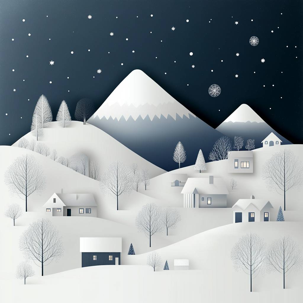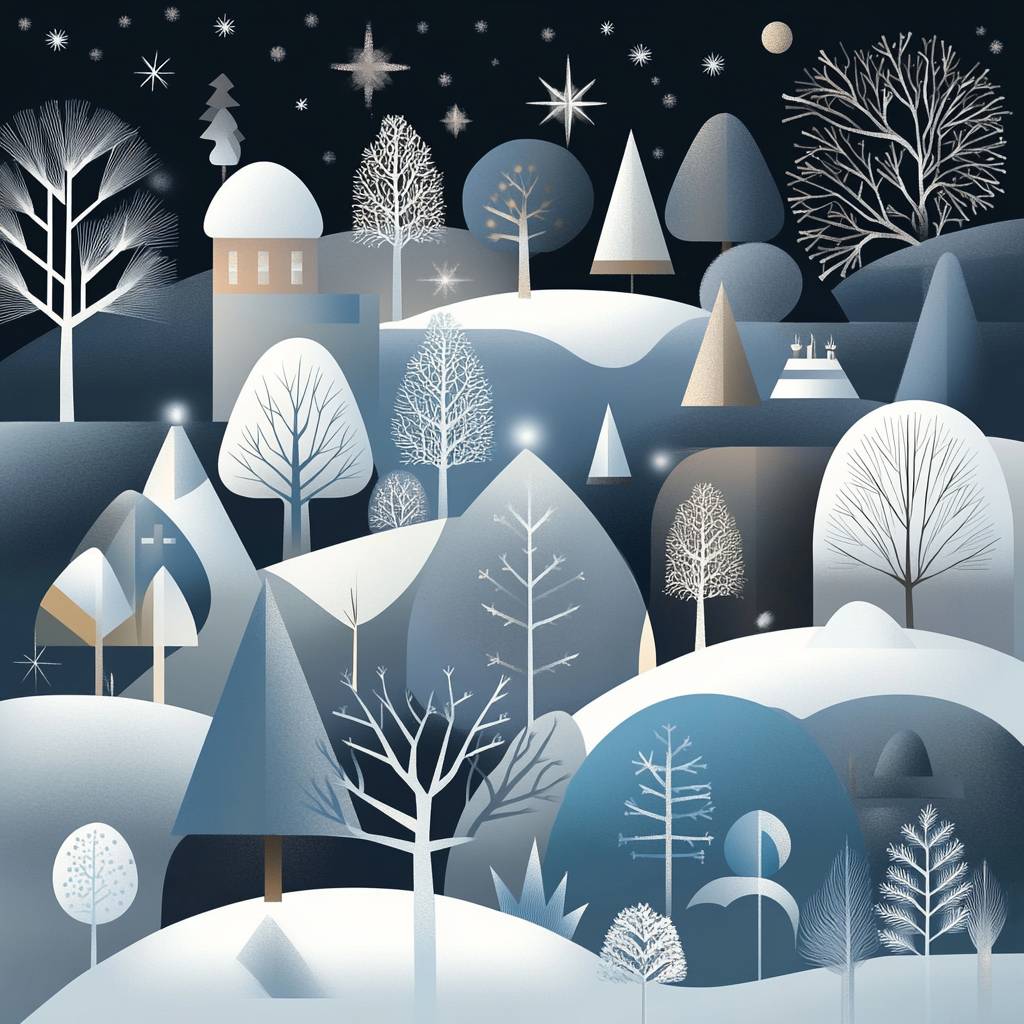 新年夜的冬季雪景插圖,銀色和藍色,由Bob Staake創作