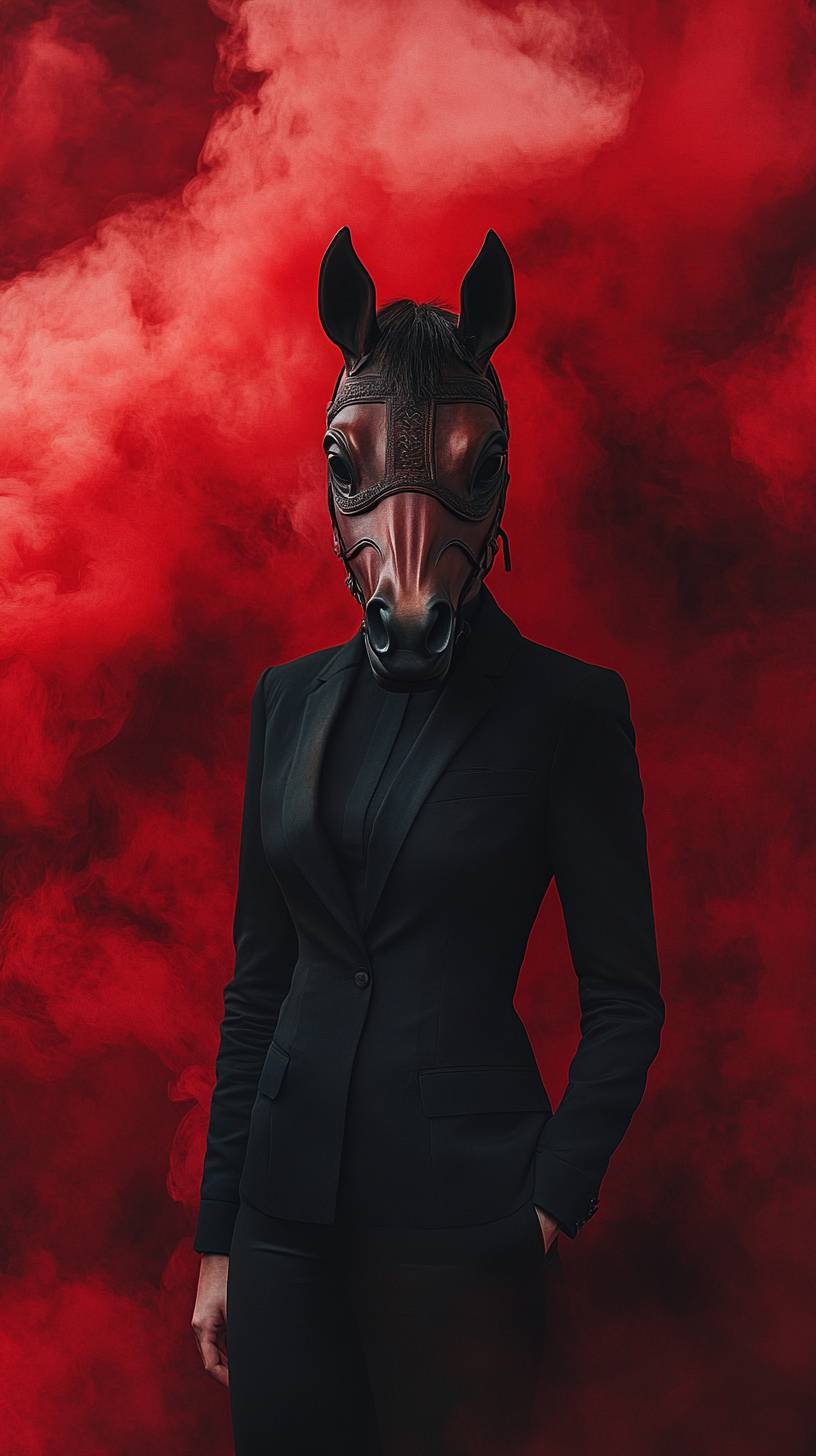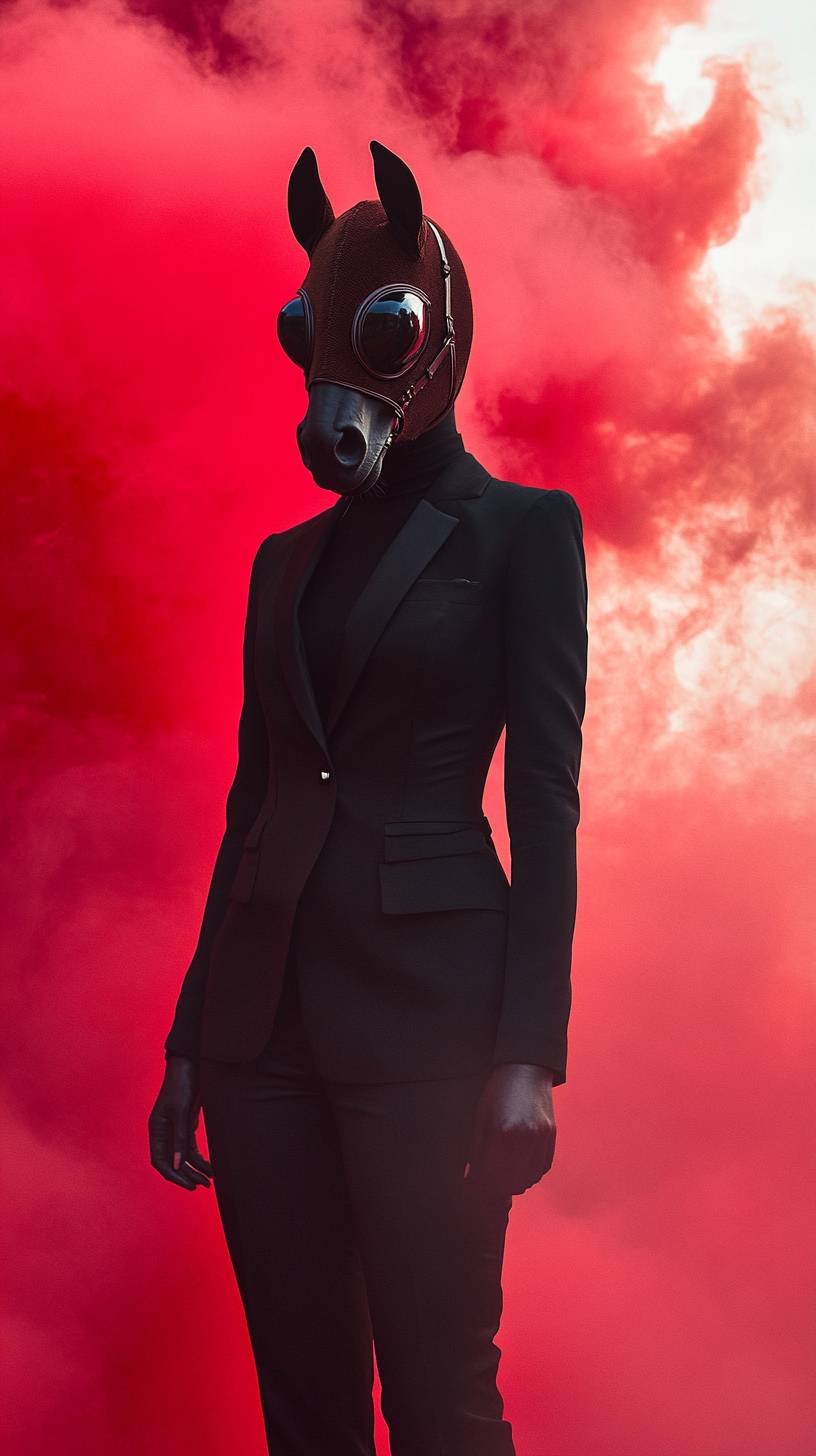 在中景鏡頭中,整個人看起來像一個靜靜站立的神秘身影。她穿著一套剪裁合身的黑色西裝,簡單而明亮的線條勾勒出她的身形。她的臉上戴著一副精緻的棕色馬頭面具,工藝精湛,細節逼真,眼中閃爍著力量的光芒。畫面的背景是一團紅色煙霧,背景色簡單呈現為紅色。