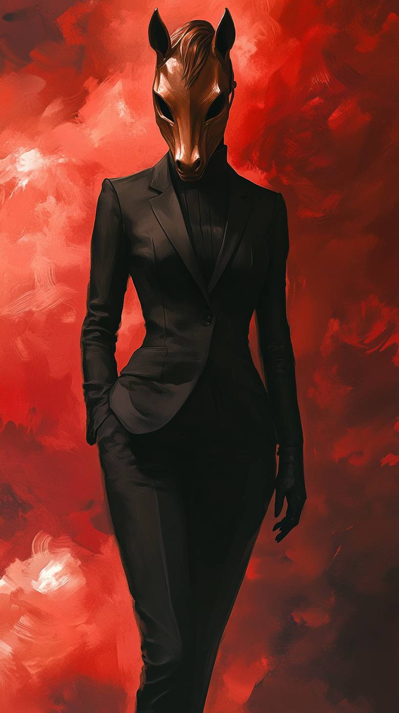 她穿著剪裁精緻的黑色西裝,佩戴著精美的棕色馬頭面具,背景是紅色煙霧。