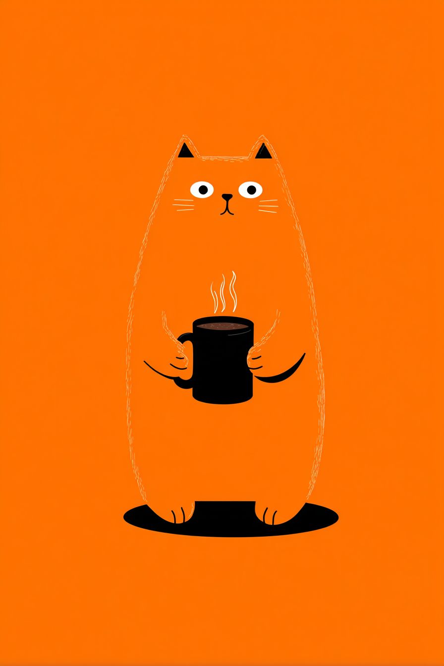 一幅充滿幻想的插圖,一隻胖胖的橘色貓咪正在拿著一杯冒著熱氣的咖啡,極簡主義扁平設計,鮮明簡單的色彩,古怪的幽默感,現代海報藝術,乾淨的矢量風格。