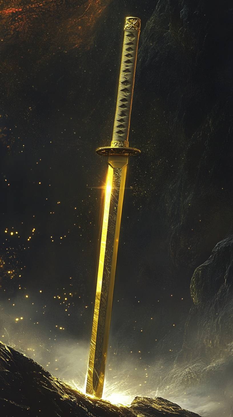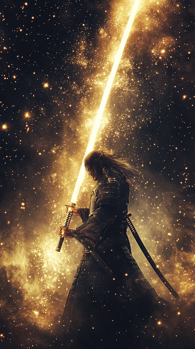 A shining sword, a twinkling star, a golden sword, a Japanese sword, one man --ar 9:16 --v 6.1