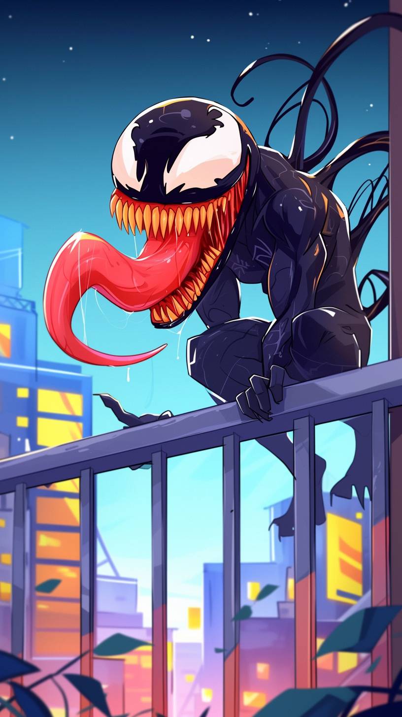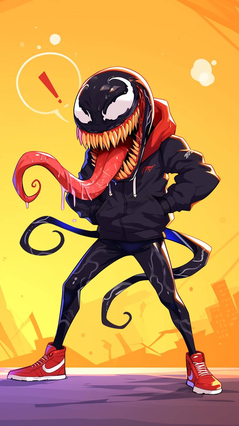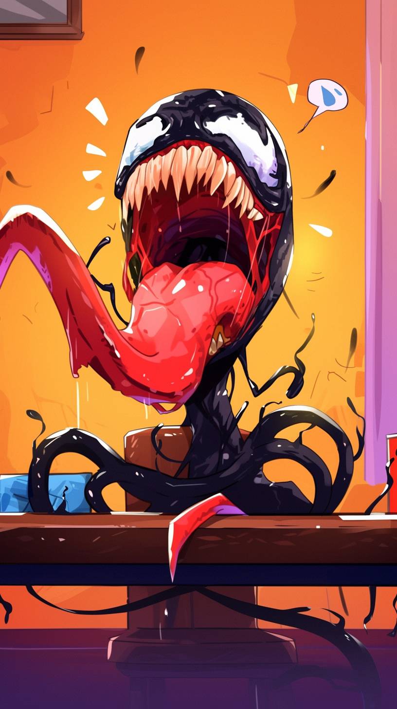 a cartoon of Venom, in the style of kenny scharf, grotesque caricatures --ar 9:16 --style raw --sref 910850746 --niji 6
