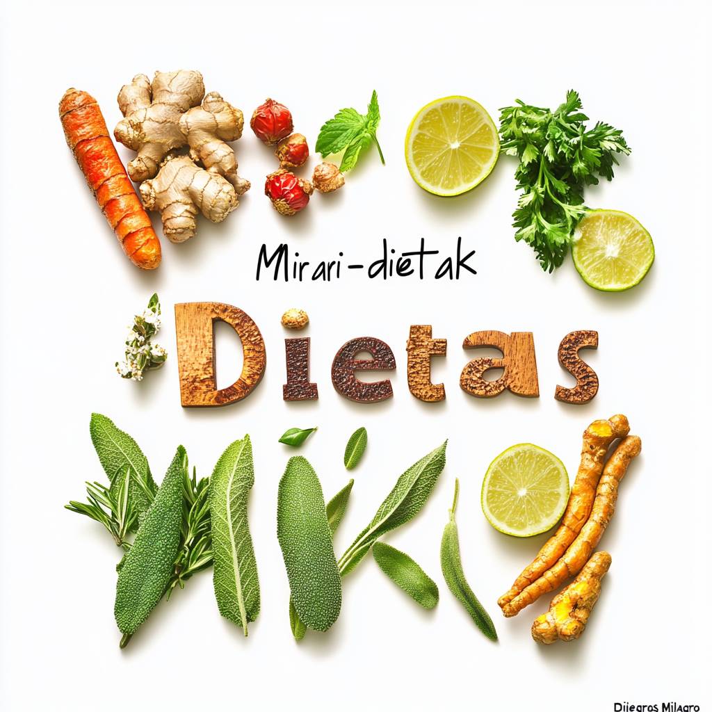 創建一幅白色背景的圖像,上面寫著“Mirari-dietak”,文字“Dietas Milagro”由菠蘿、薑黃、楓糖漿、檸檬、生薑和蜜蜂組成。