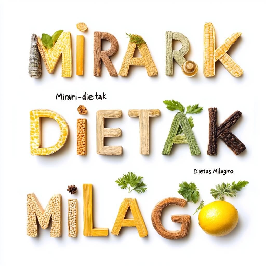 Crea una imagen, en fondo blanco, donde se lea "Mirari-dietak". Las letras de la palabra "Dietas Milagro" tienen que estar creadas con los siguientes elementos: Piñas. curcuma, sirope de arce, limón, jengibre, miel, --v 6.1 --style raw