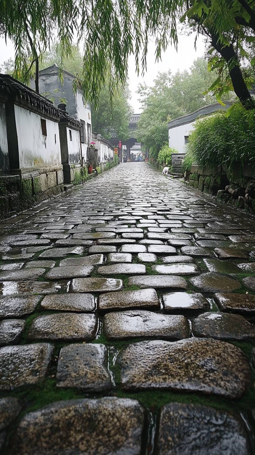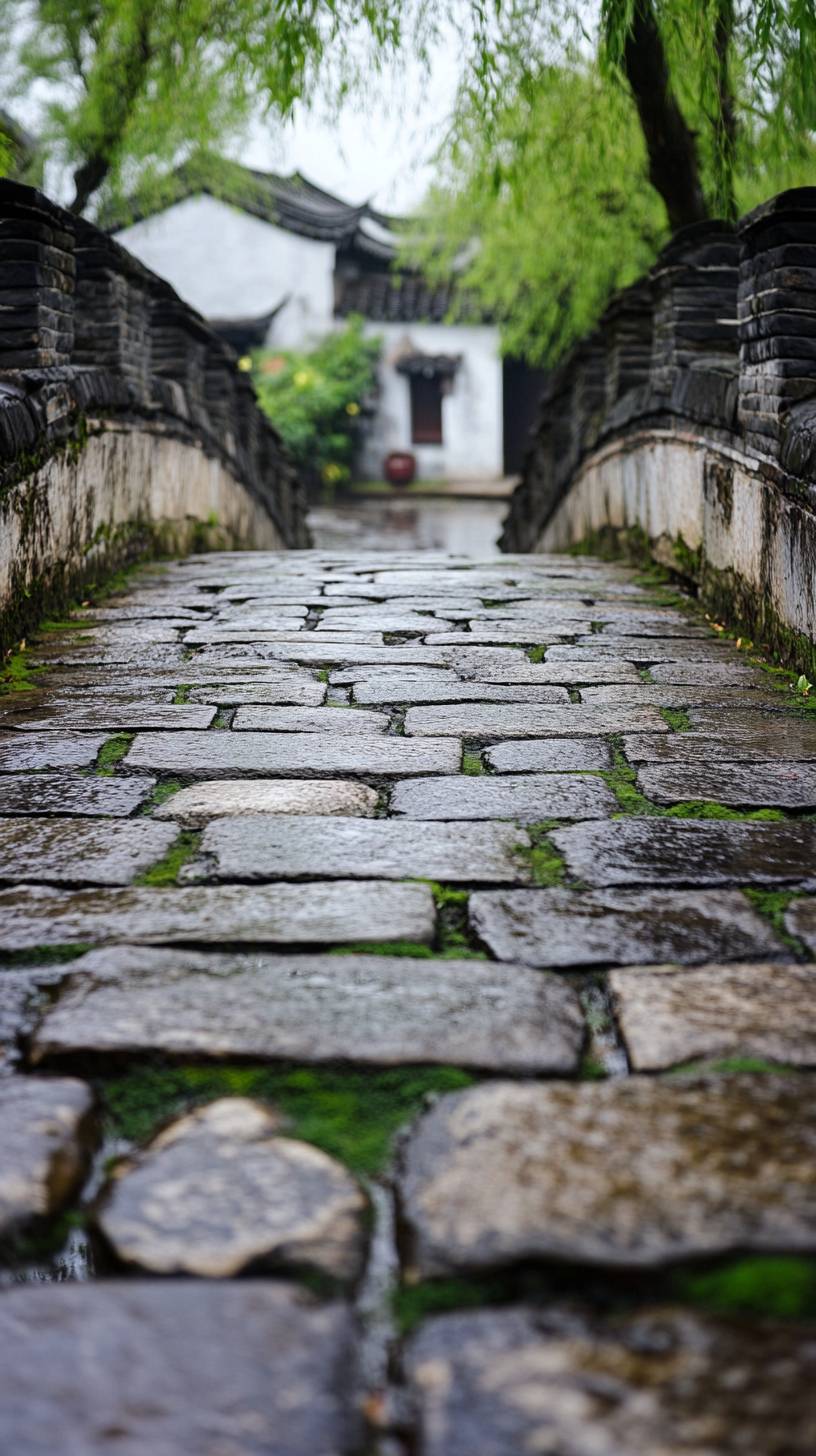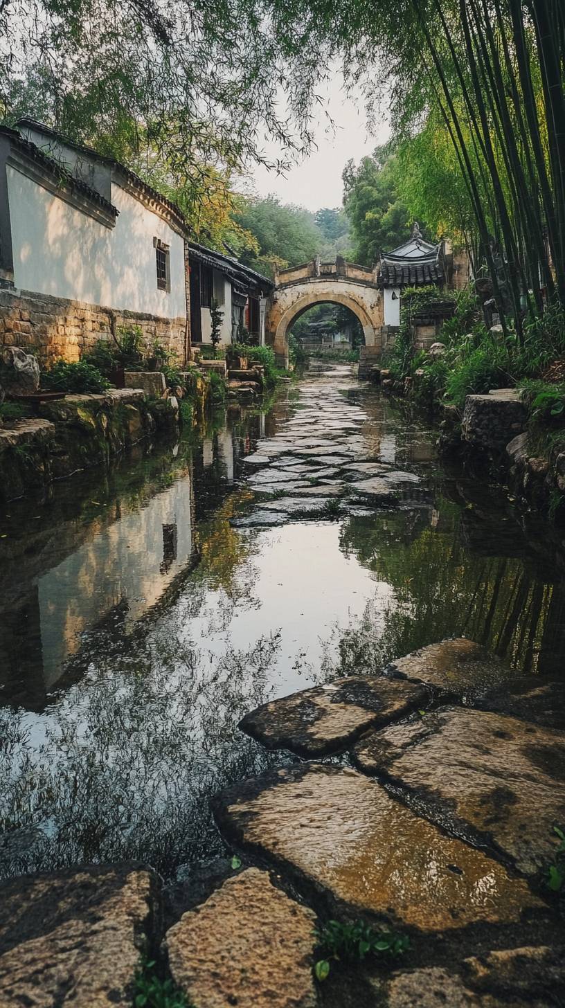 On the ancient bridge in Jiangnan, the cobblestone path after rain reflects the surrounding old houses and green bamboo, the water beneath the bridge is calm as a mirror, the air filled with a fresh and moist scent, bringing a deep sense of healing. --ar 9:16 --v 6.1 --style raw
