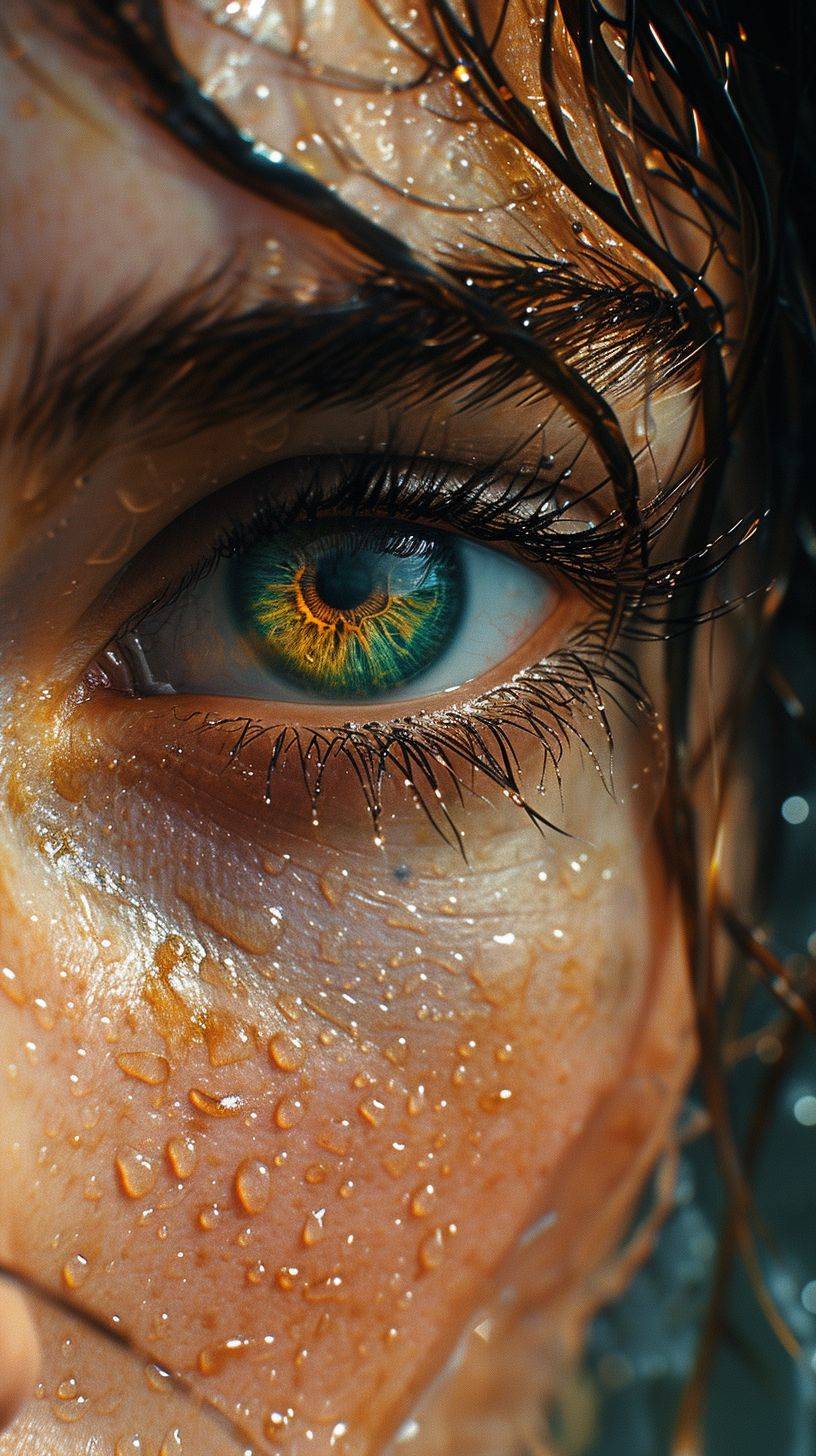 an eye caught in a water drop, in the style of cryengine, pegi nicol macleod, realistic genre scenes, hauntingly beautiful narratives, ultra realistic, thomas saliot, close up --ar 9:16 --v 6 --stylize 750