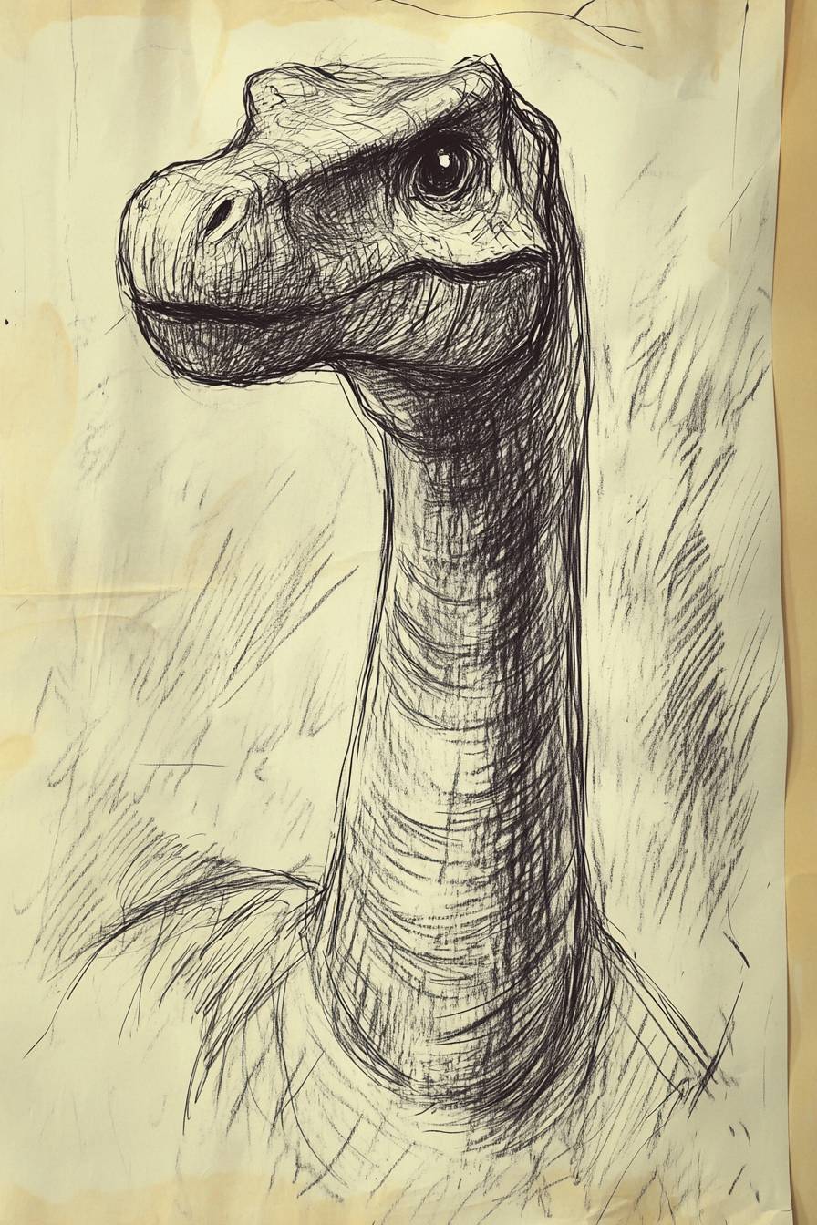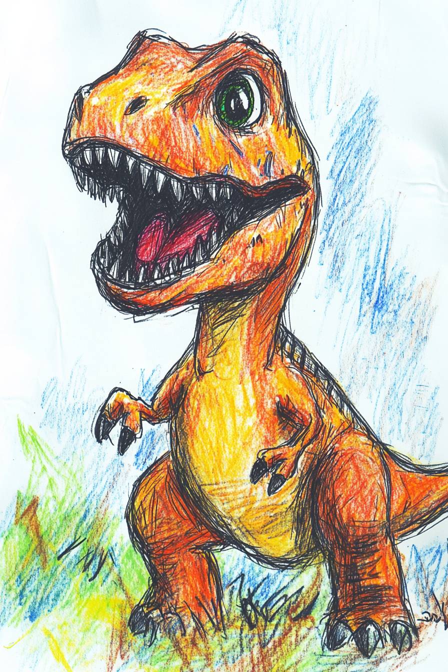 Children's doodles, dinosaurs, crayon scribbles, with an innocent and youthful style, featuring a handmade texture and rough lines. Filled with childlike charm and vitality, it showcases simple exaggerated shapes, loose proportions, and naturally irregular lines, with a noticeable grainy texture of the crayon. --v 6.1 --ar 2:3