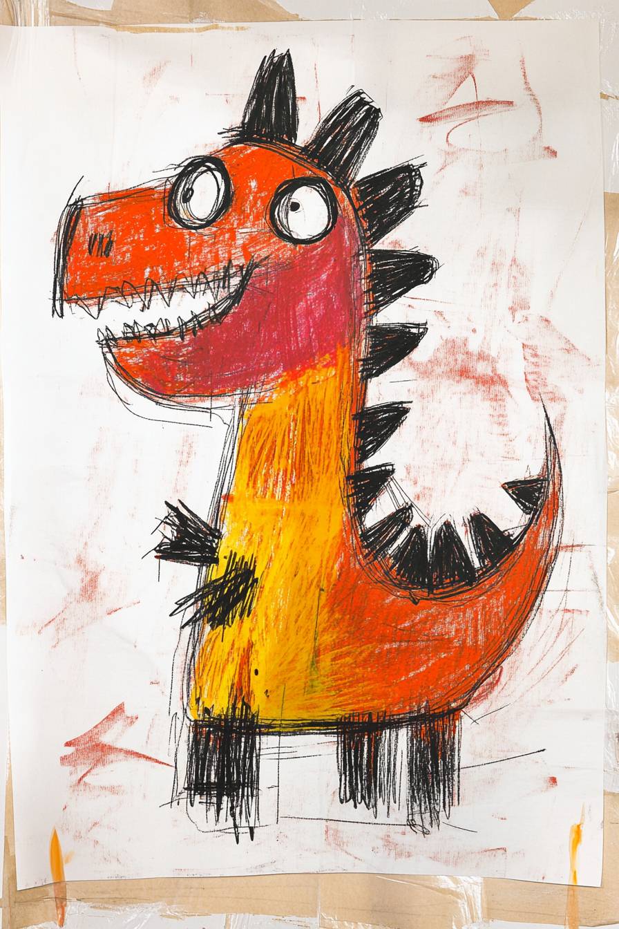 小孩的塗鴉、恐龍、蠟筆亂塗,以無辜和青春的風格為特徵,具有手工質感和粗糙的線條。充滿童趣和活力,展示了簡單誇張的形狀、寬鬆的比例和自然不規則的線條,蠟筆的顆粒質感十分明顯。