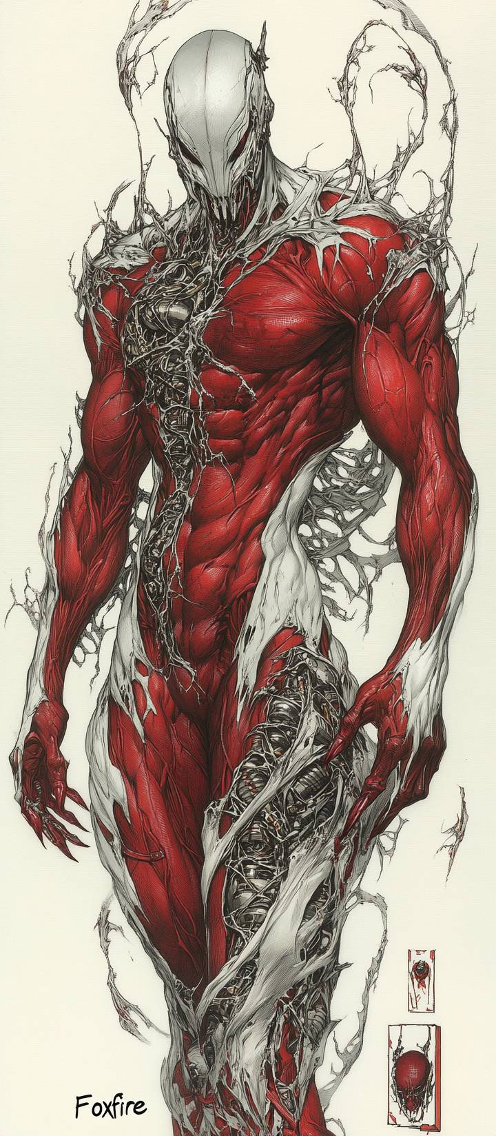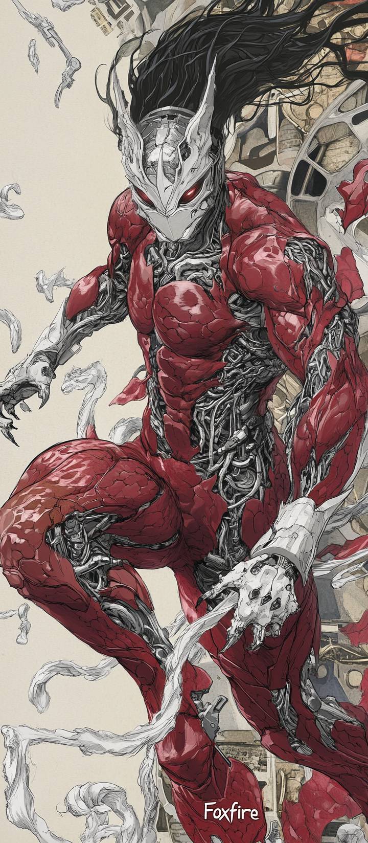 Witchblade and Darkness suit nine tails exoskeleton, fluid red silver liquid metal full plate armor, muscle tissue, Evolution on the Foxyborg Ultimate form, Gundam suit superwhite, Fundoshi Bodybuilder, Super Hero "Foxfire", very muscular, atomic chest, super hero, character portrait, vivid art style, by barry windsor-smith --ar 45:103 --profile 75s6eit --v 6.1