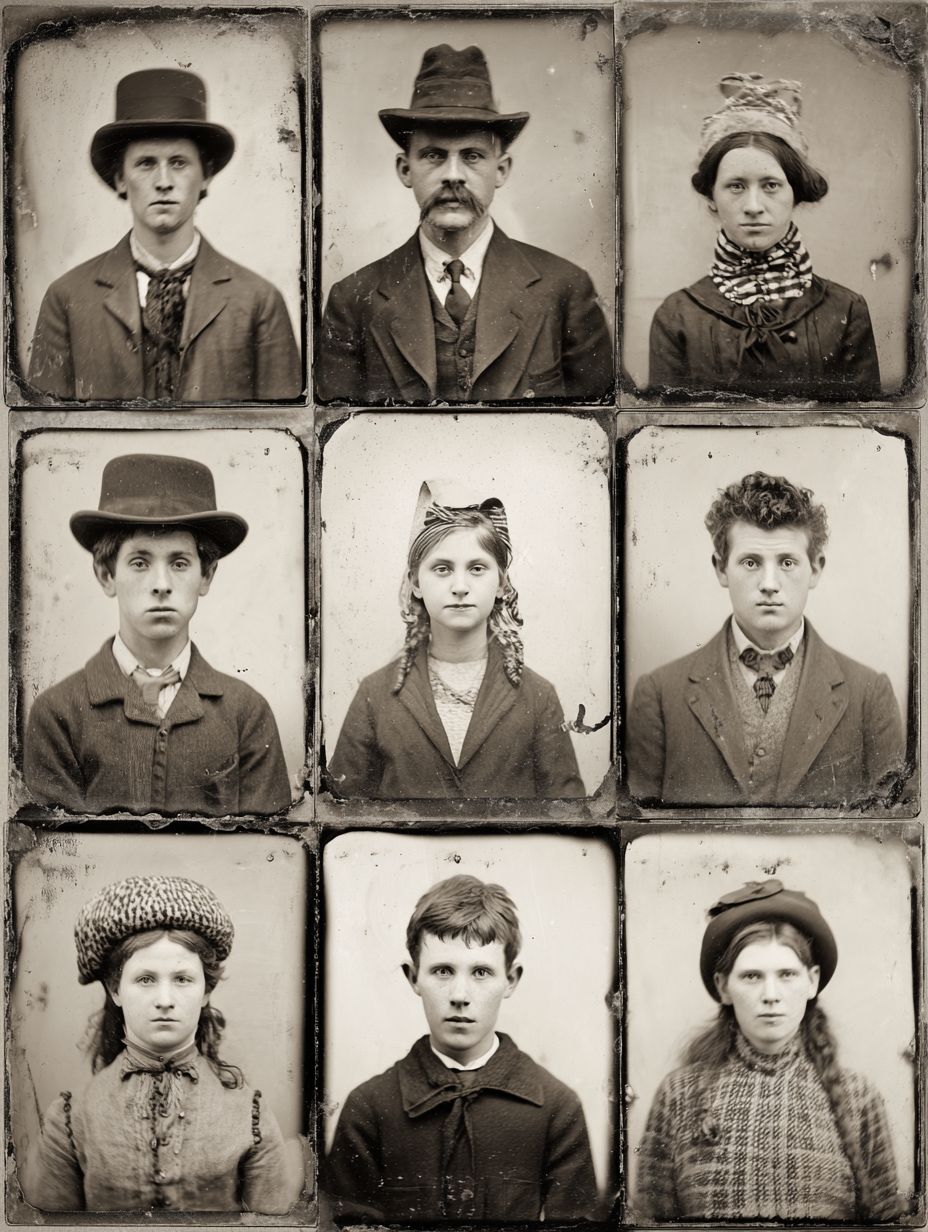 一組展示1900年至1920年間穿著當時服飾的成人的復古攝影肖像網格。採用濕版膠棉攝影風格,背景為純白色。